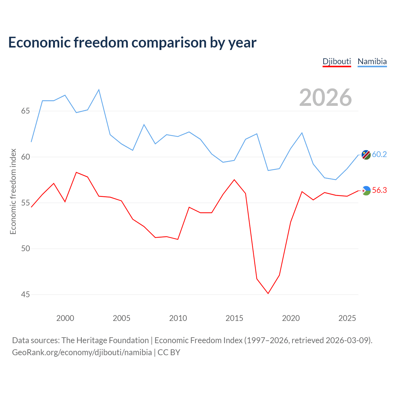 The Economic Freedom Index for Djibouti is 56.3, ranking 122/197, compared to 60.2 for Namibia, ranking 95/197. The chart above displays a comparison of annual changes in economic freedom indexes.