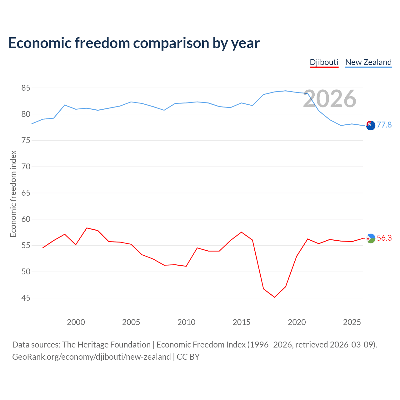 The Economic Freedom Index for Djibouti is 56.3, ranking 122/197, compared to 77.8 for New Zealand, ranking 13/197. The chart above displays a comparison of annual changes in economic freedom indexes.