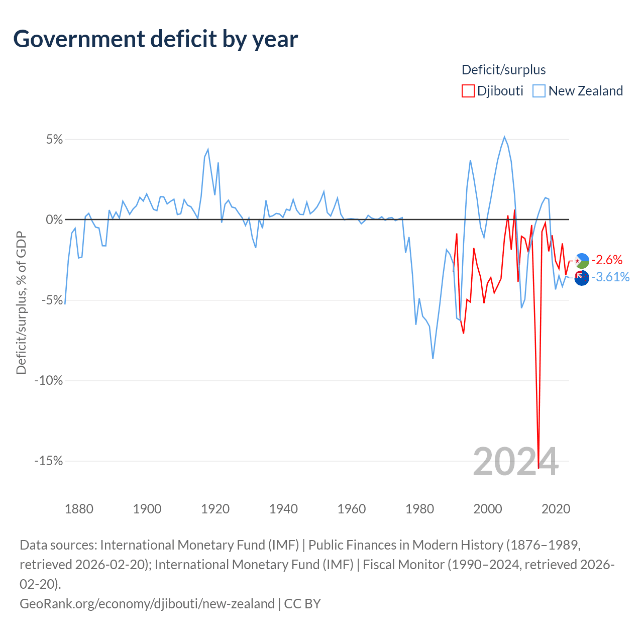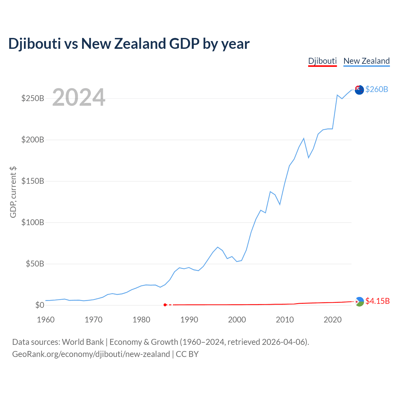 Djibouti has a GDP of $4.15B compared to $260B for New Zealand, ranking 165/197 and 52/197 by economy size, respectively.