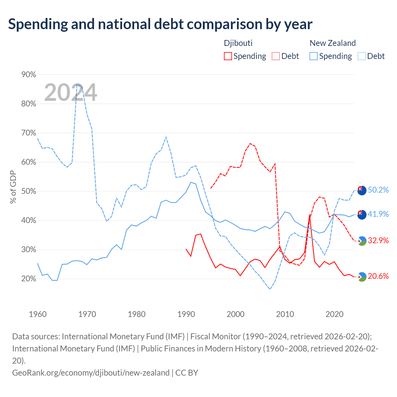 Djibouti has $1.36B in government debt (32.9% of GDP), compared to $131B (50.2% of GDP) in New Zealand.