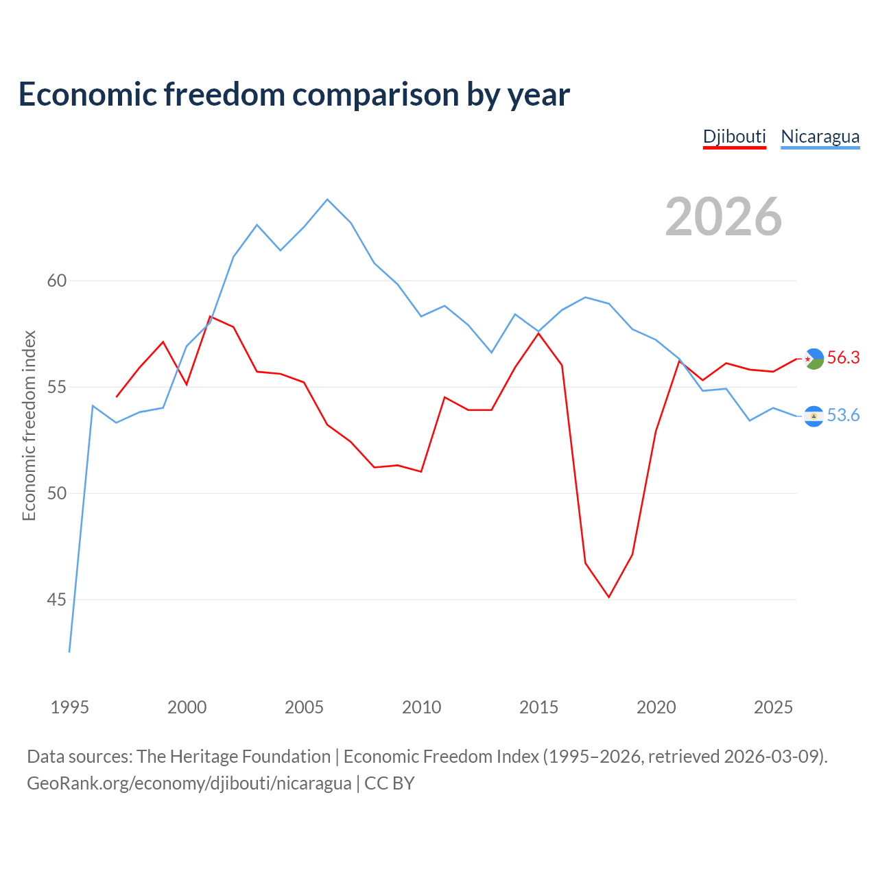 The Economic Freedom Index for Djibouti is 56.3, ranking 122/197, compared to 53.6 for Nicaragua, ranking 139/197. The chart above displays a comparison of annual changes in economic freedom indexes.