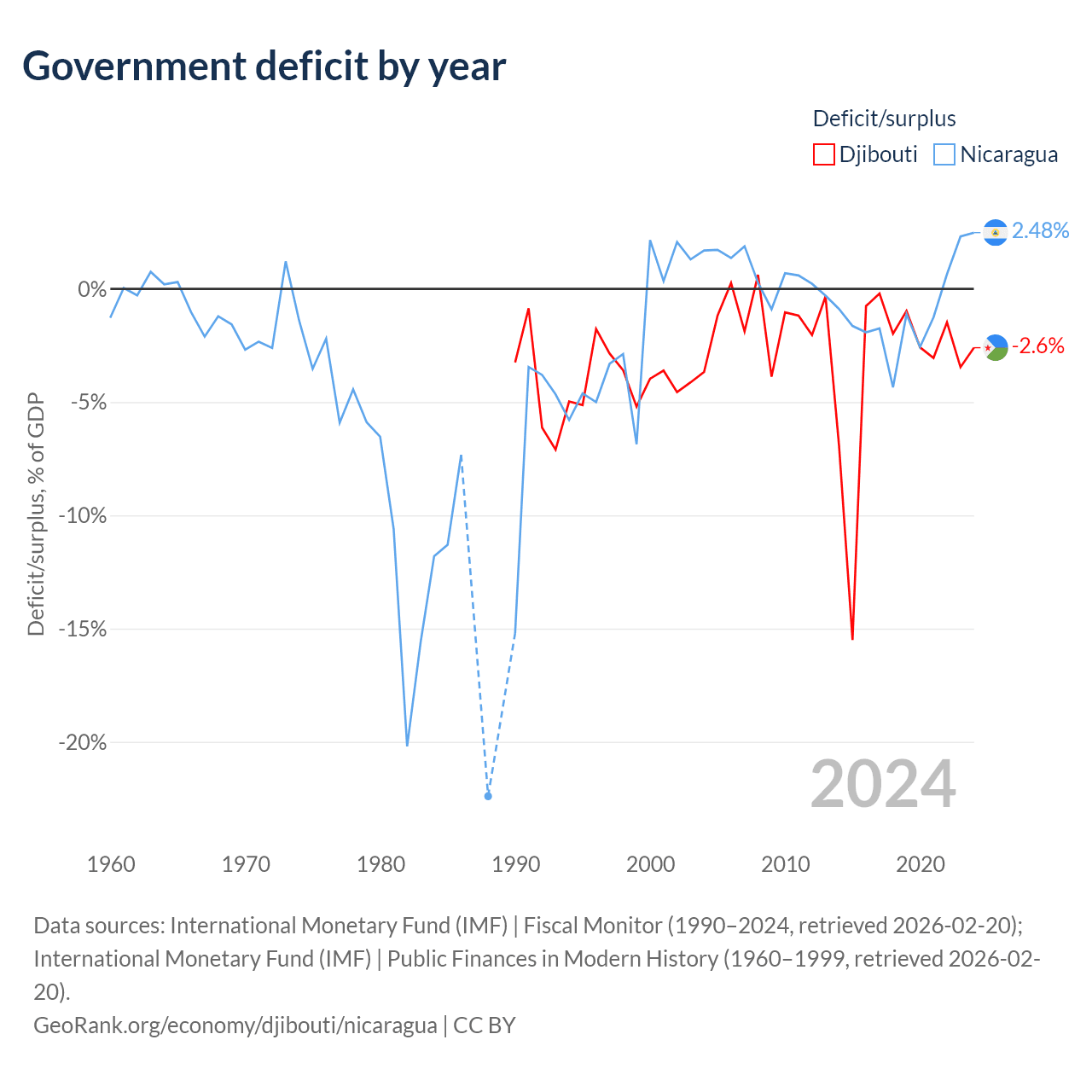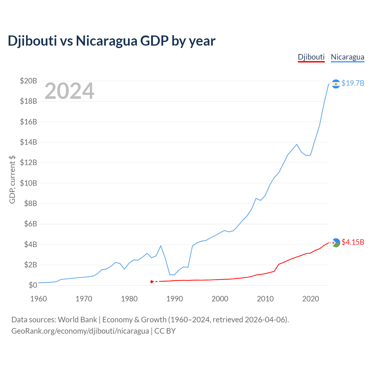 Djibouti has a GDP of $4.15B compared to $19.7B for Nicaragua, ranking 165/197 and 131/197 by economy size, respectively.