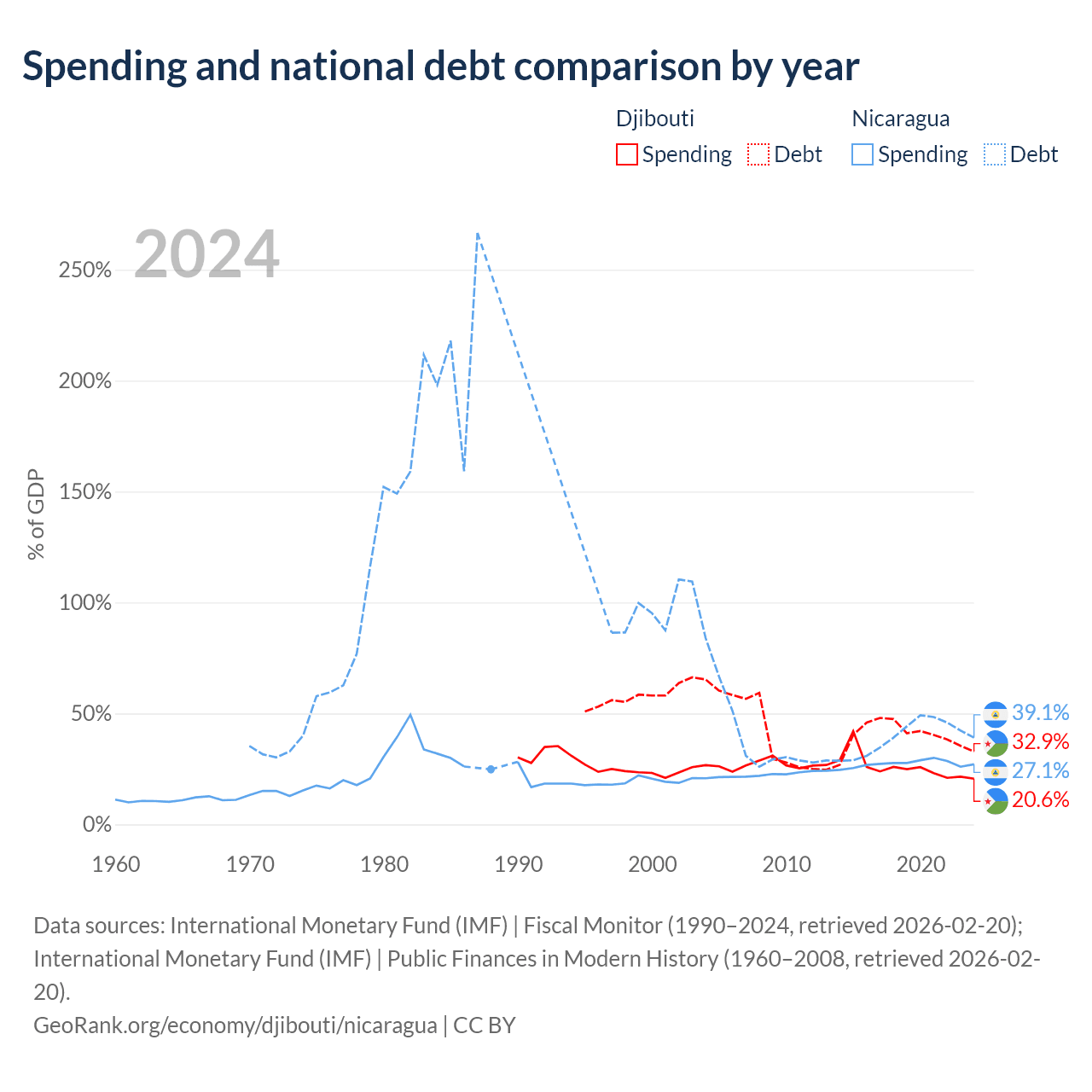 Djibouti has $1.36B in government debt (32.9% of GDP), compared to $7.71B (39.1% of GDP) in Nicaragua.