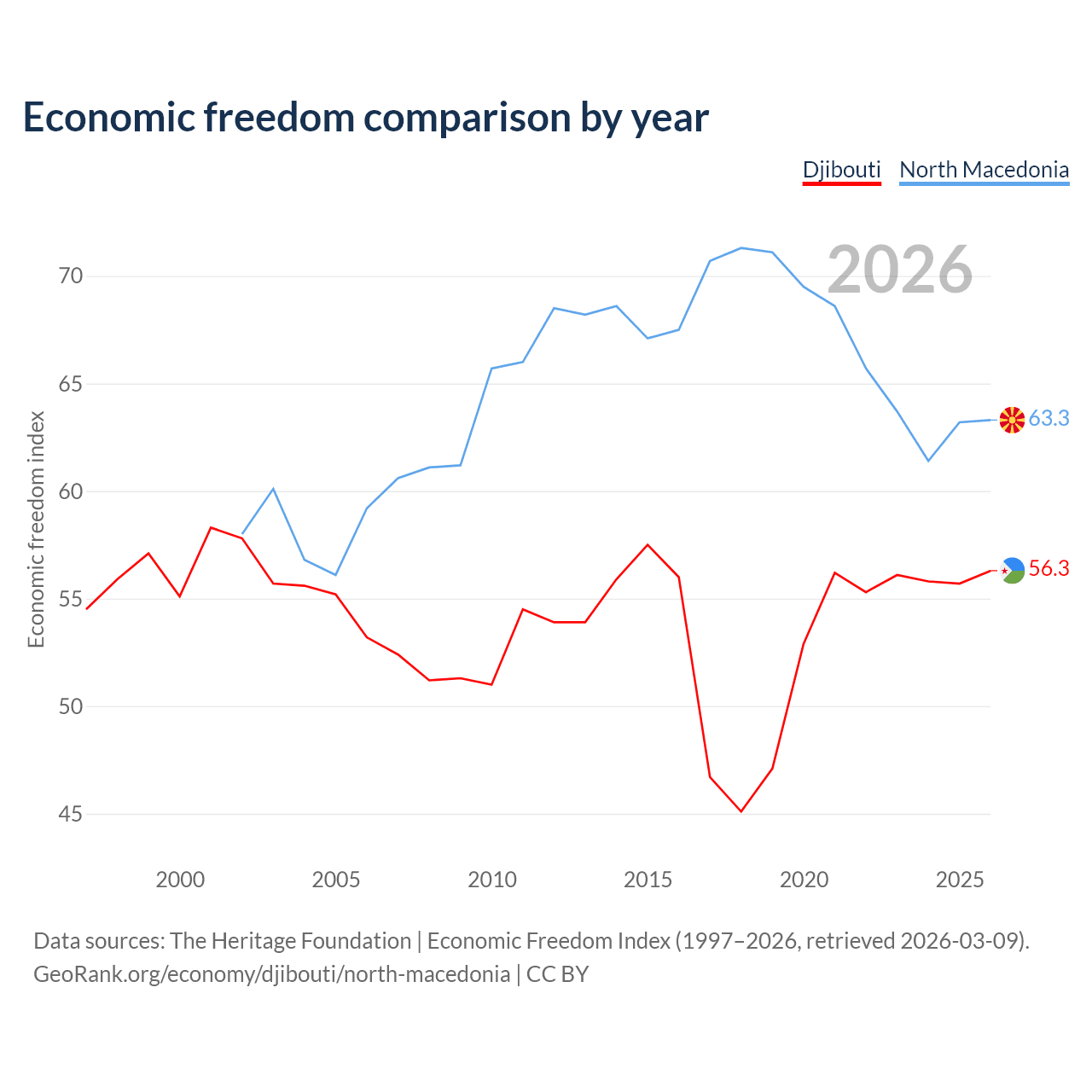 The Economic Freedom Index for Djibouti is 56.3, ranking 122/197, compared to 63.3 for North Macedonia, ranking 81/197. The chart above displays a comparison of annual changes in economic freedom indexes.