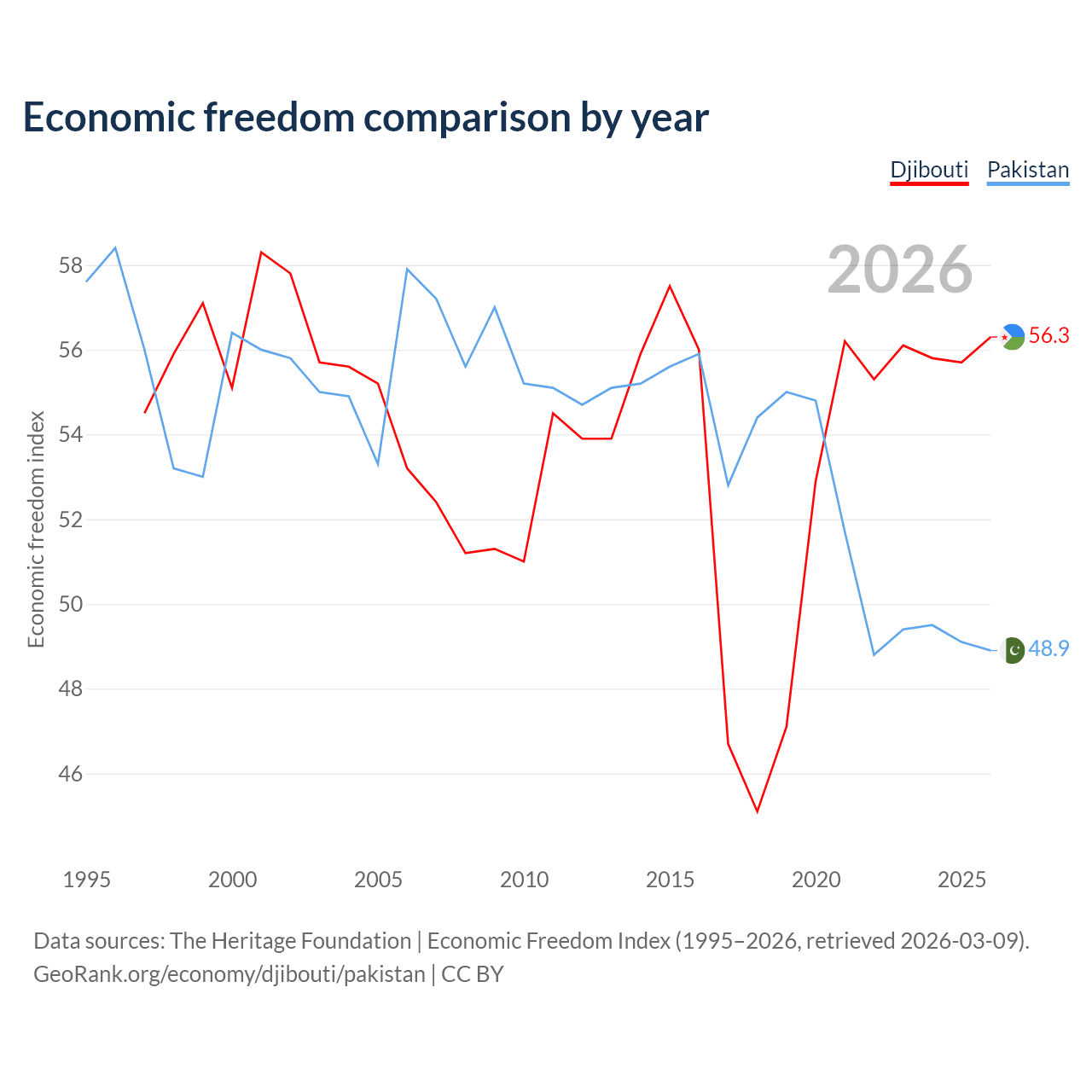 The Economic Freedom Index for Djibouti is 56.3, ranking 122/197, compared to 48.9 for Pakistan, ranking 168/197. The chart above displays a comparison of annual changes in economic freedom indexes.