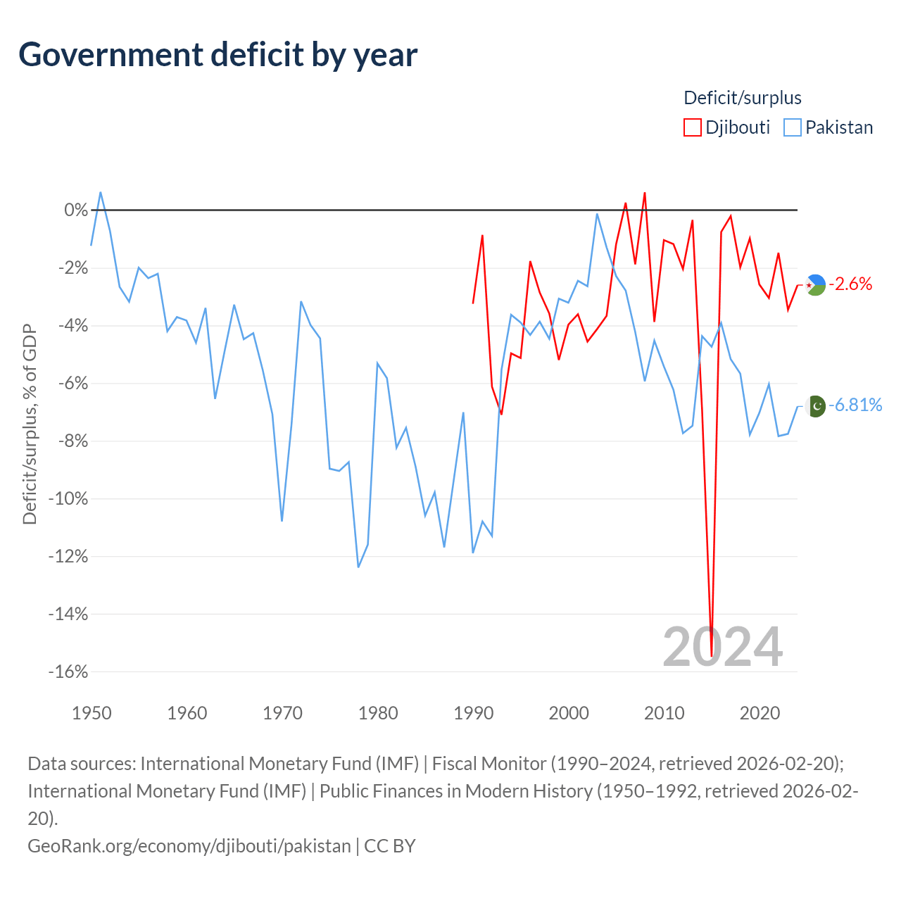 Djibouti has a GDP of $4.15B compared to $372B for Pakistan, ranking 165/197 and 43/197 by economy size, respectively.