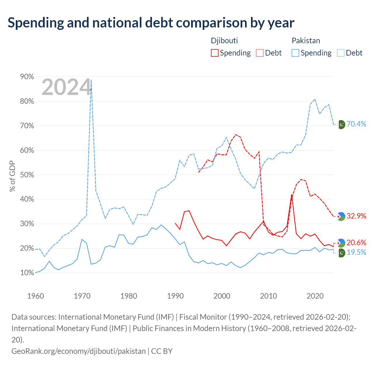 Djibouti has $1.36B in government debt (32.9% of GDP), compared to $262B (70.4% of GDP) in Pakistan.