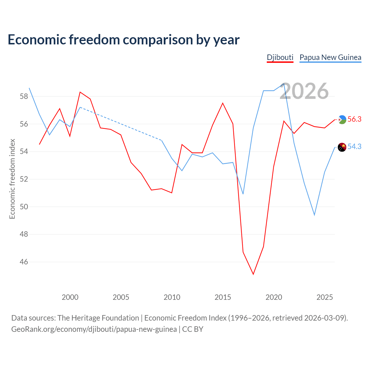 The Economic Freedom Index for Djibouti is 56.3, ranking 122/197, compared to 54.3 for Papua New Guinea, ranking 134/197. The chart above displays a comparison of annual changes in economic freedom indexes.