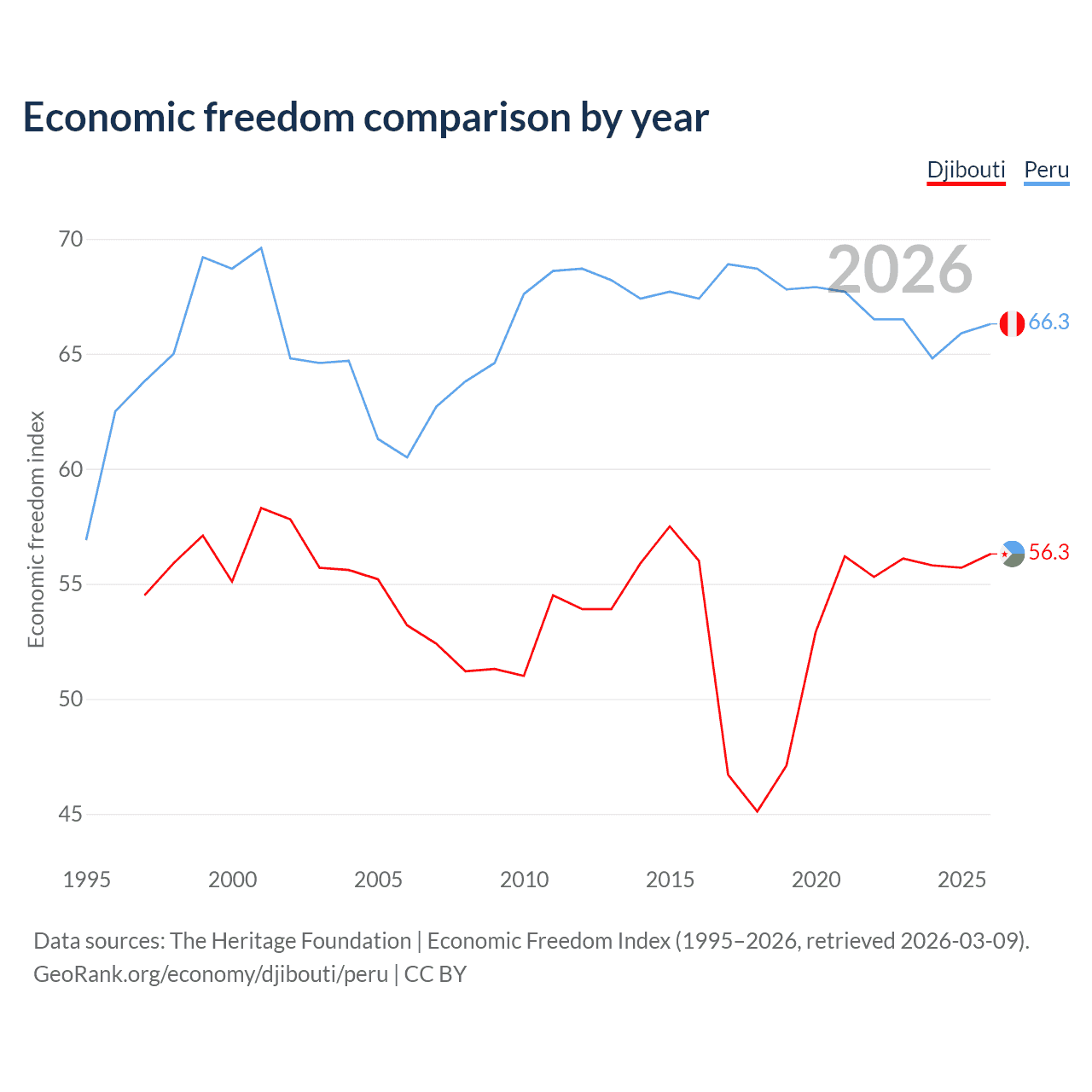 The Economic Freedom Index for Djibouti is 56.3, ranking 122/197, compared to 66.3 for Peru, ranking 62/197. The chart above displays a comparison of annual changes in economic freedom indexes.