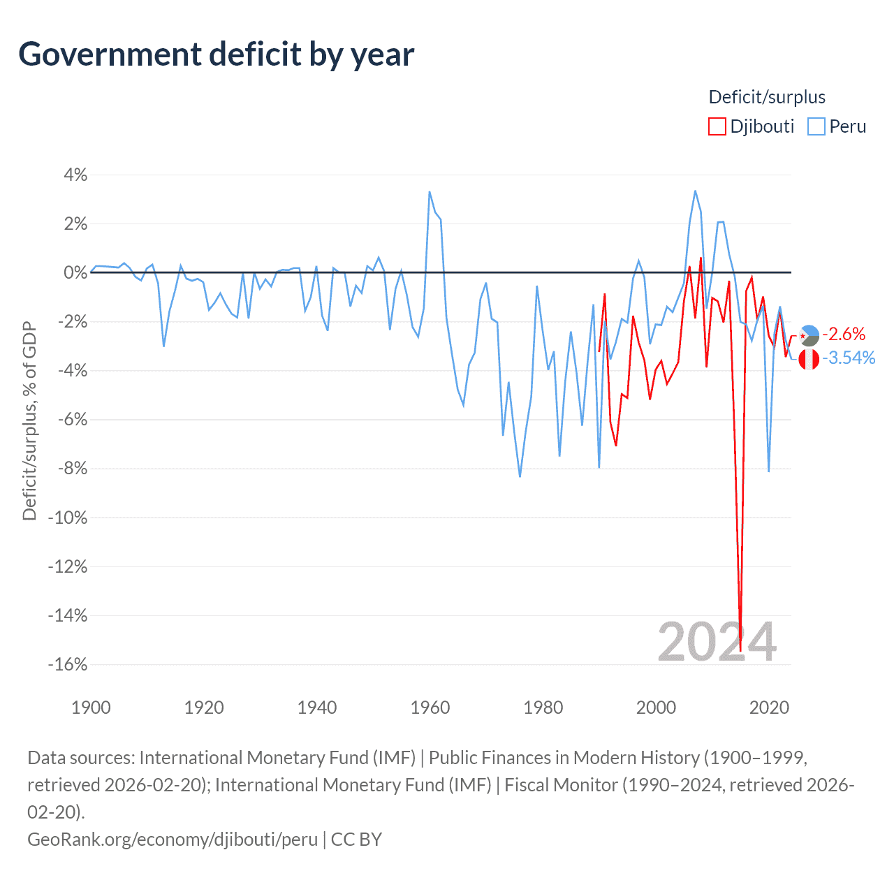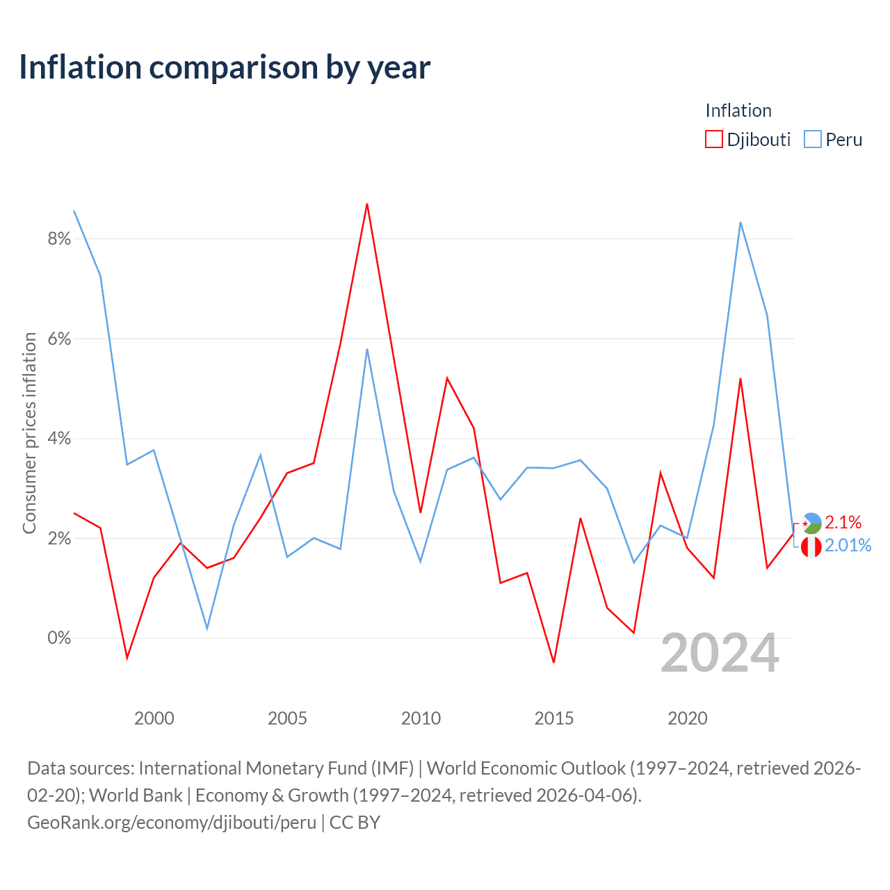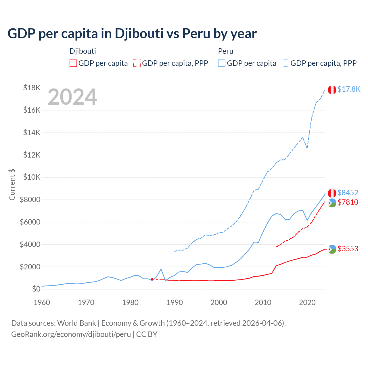 Djibouti has a GDP of $4.15B compared to $289B for Peru, ranking 165/197 and 49/197 by economy size, respectively.