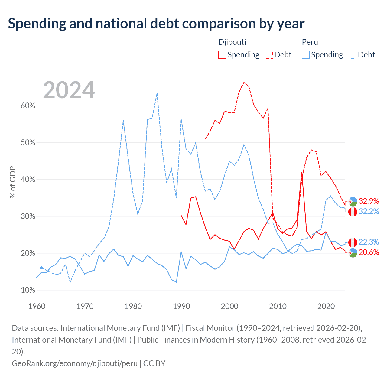 Djibouti has $1.36B in government debt (32.9% of GDP), compared to $93B (32.2% of GDP) in Peru.