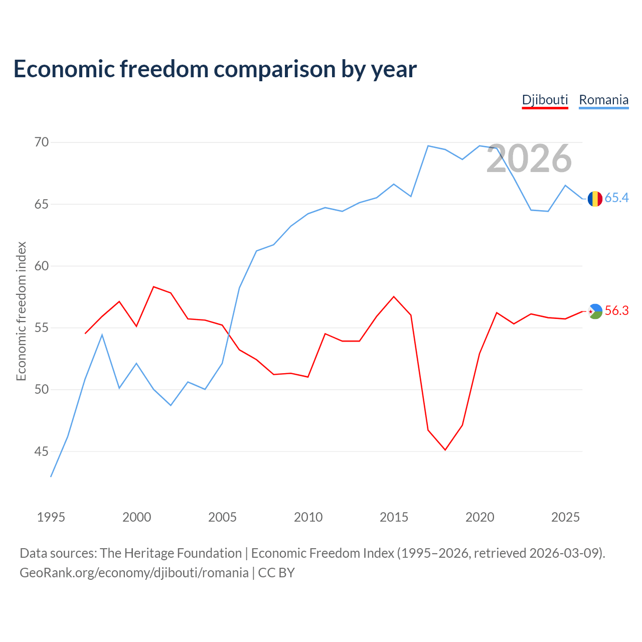 The Economic Freedom Index for Djibouti is 56.3, ranking 122/197, compared to 65.4 for Romania, ranking 64/197. The chart above displays a comparison of annual changes in economic freedom indexes.