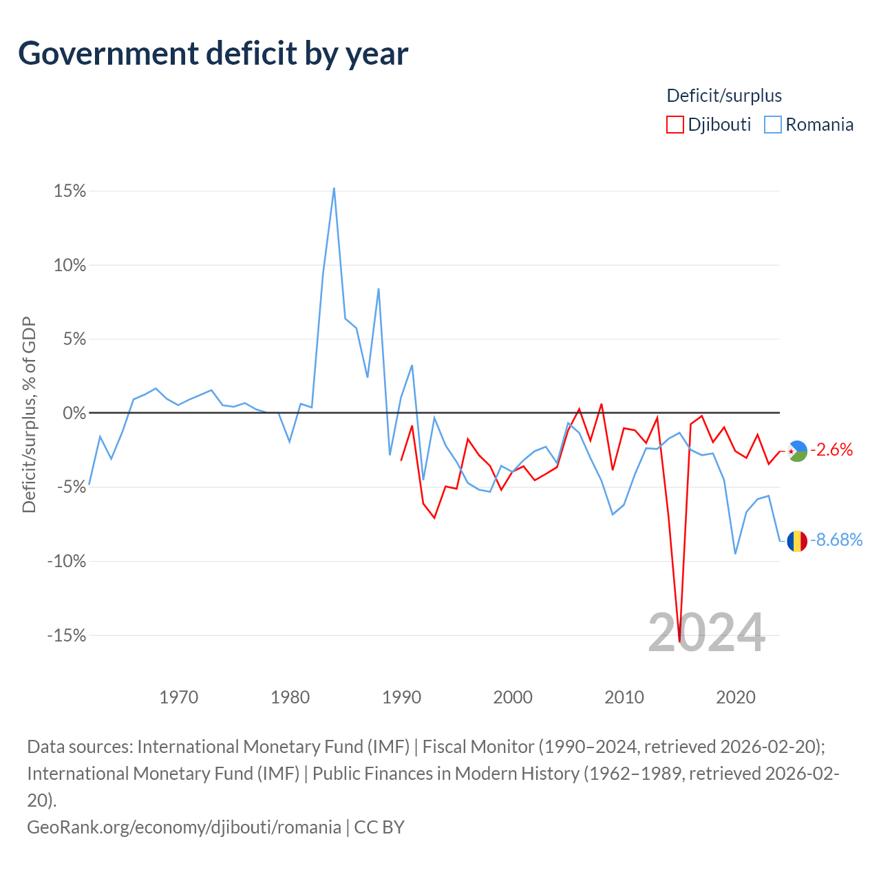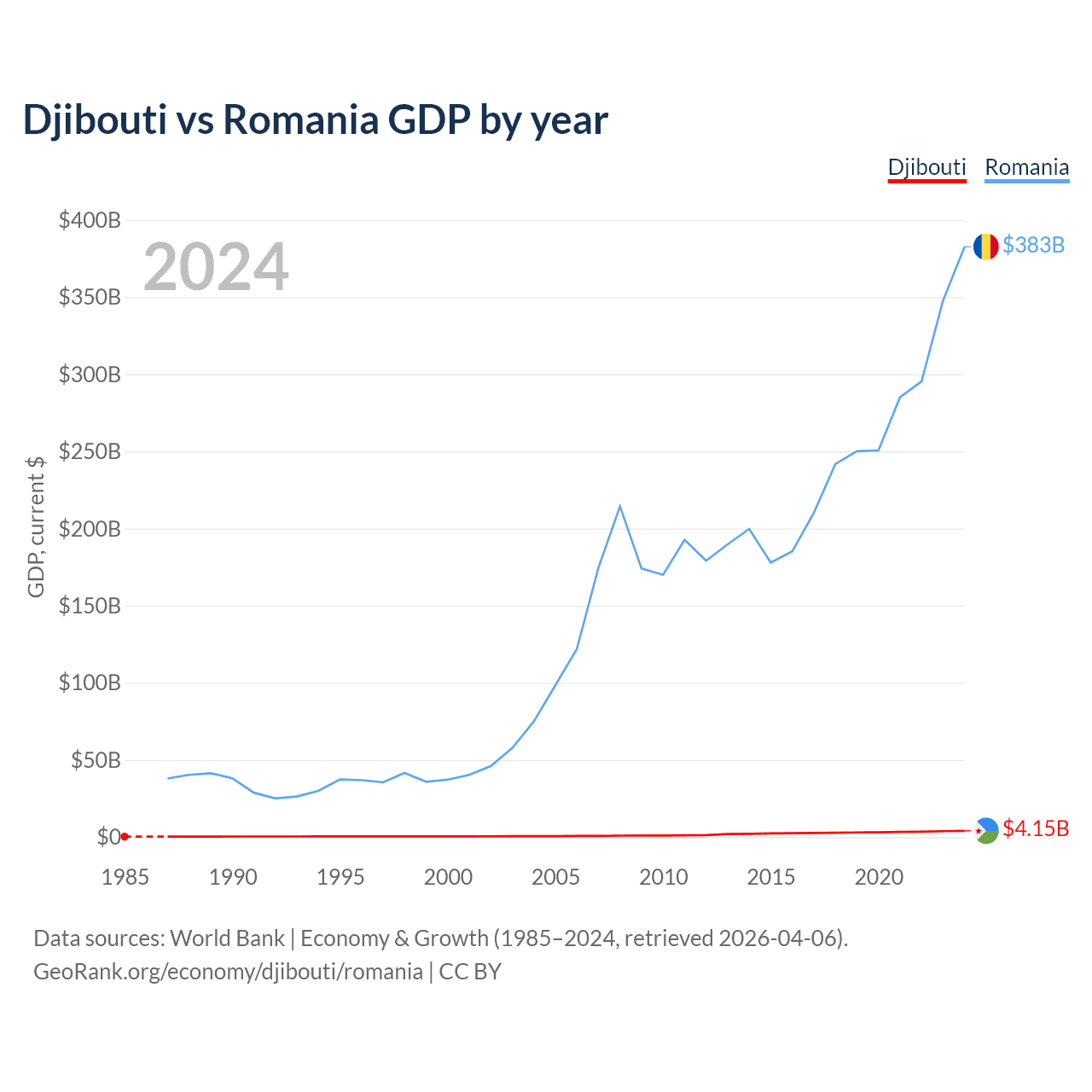 Djibouti has a GDP of $4.15B compared to $383B for Romania, ranking 165/197 and 42/197 by economy size, respectively.