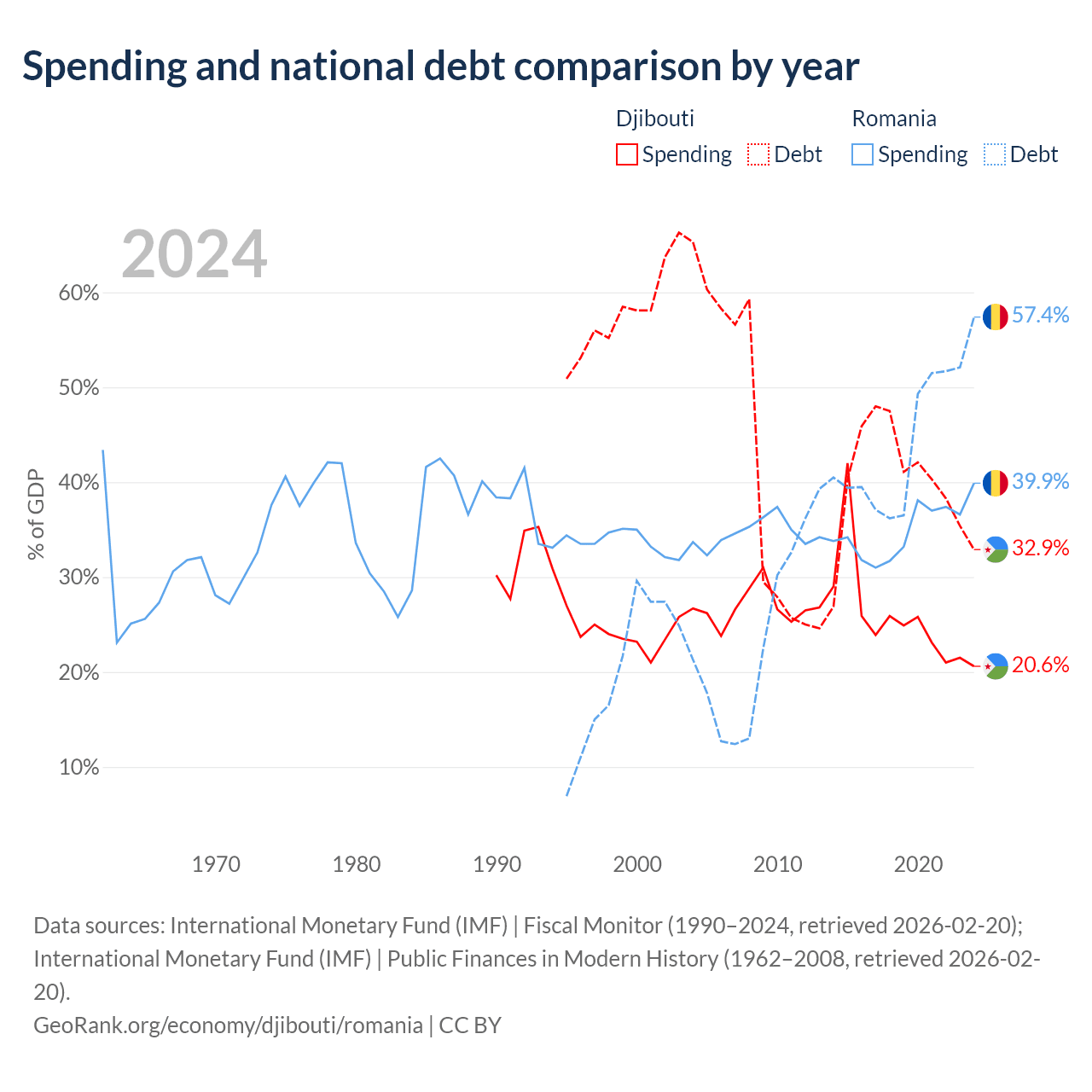 Djibouti has $1.36B in government debt (32.9% of GDP), compared to $220B (57.4% of GDP) in Romania.