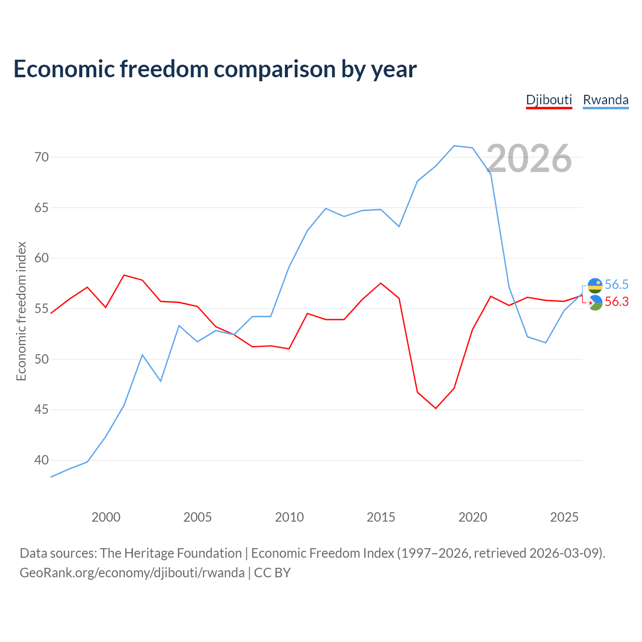 The Economic Freedom Index for Djibouti is 56.3, ranking 122/197, compared to 56.5 for Rwanda, ranking 121/197. The chart above displays a comparison of annual changes in economic freedom indexes.