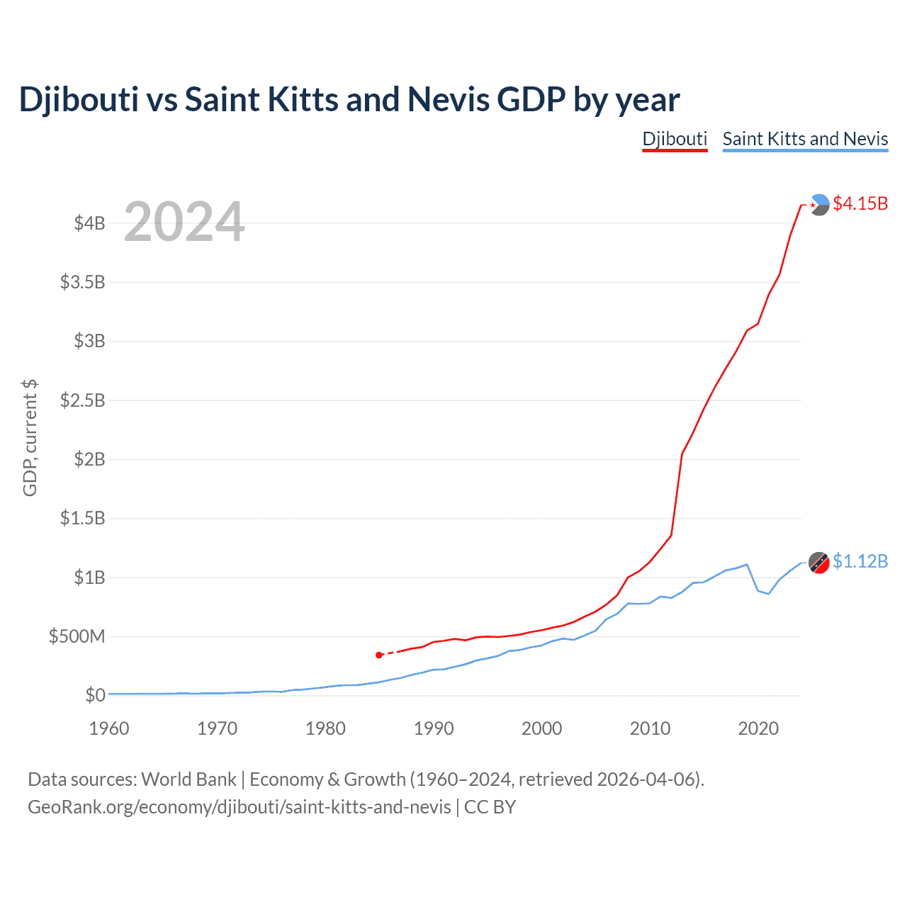 Djibouti has a GDP of $4.15B compared to $1.12B for Saint Kitts and Nevis, ranking 165/197 and 187/197 by economy size, respectively.