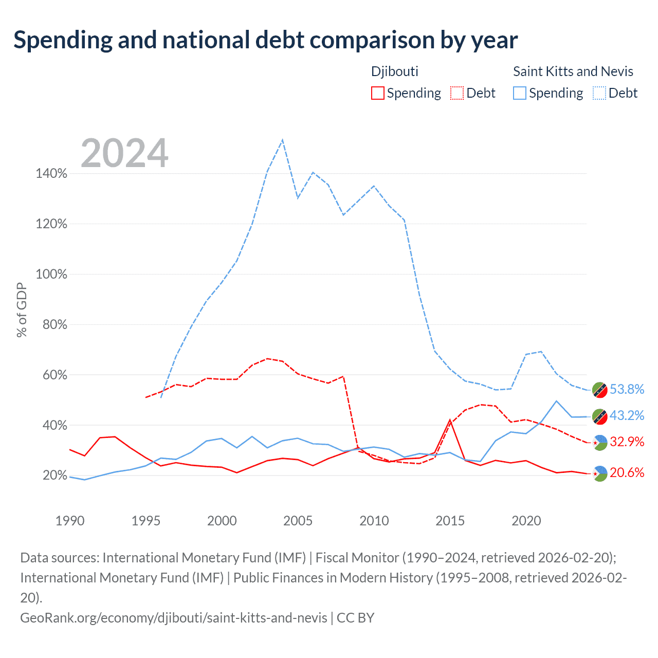 Djibouti has $1.36B in government debt (32.9% of GDP), compared to $604M (53.8% of GDP) in Saint Kitts and Nevis.
