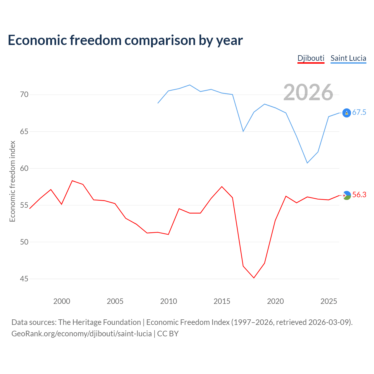 The Economic Freedom Index for Djibouti is 56.3, ranking 122/197, compared to 67.5 for Saint Lucia, ranking 57/197. The chart above displays a comparison of annual changes in economic freedom indexes.