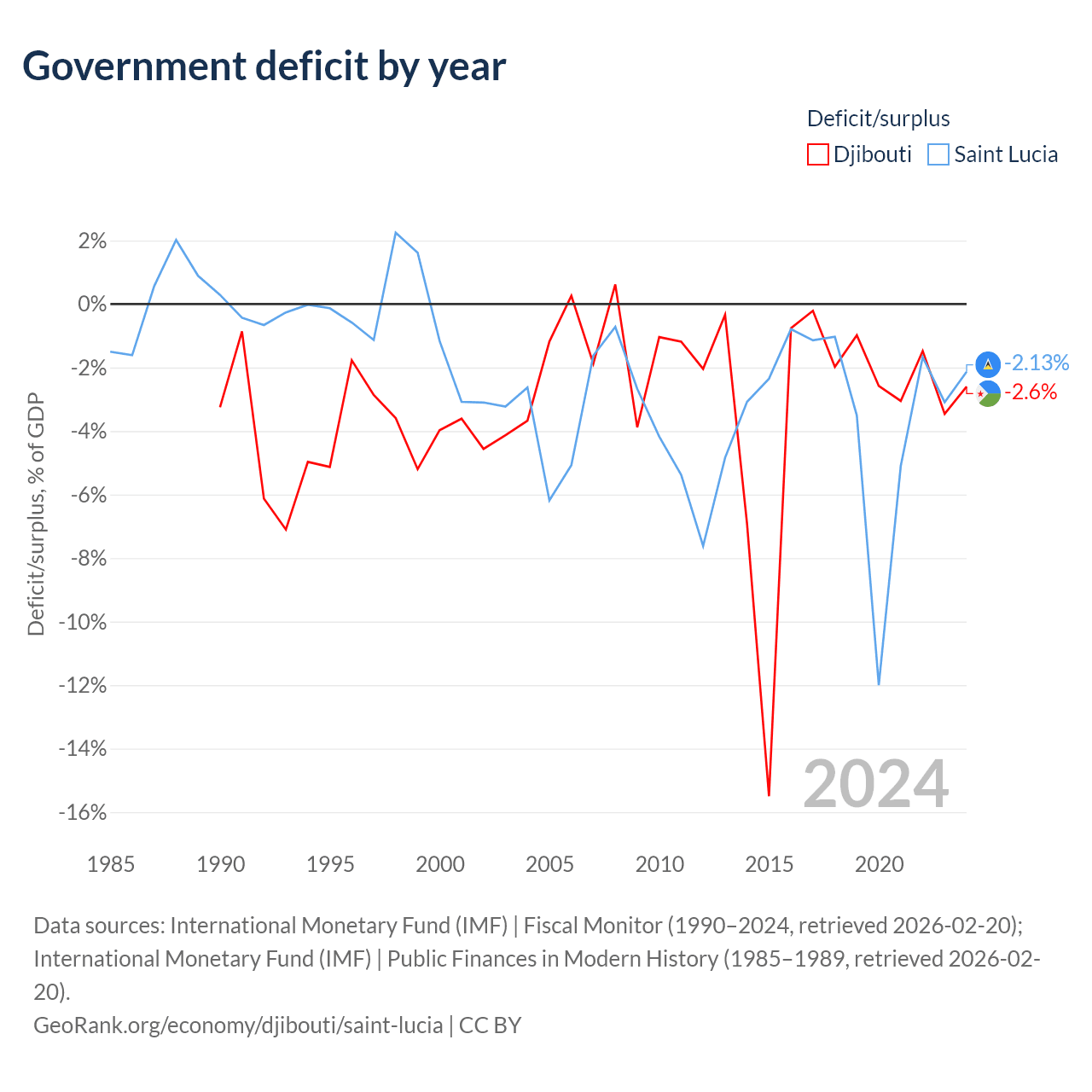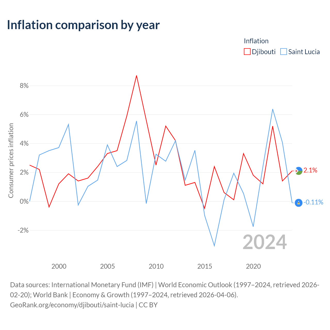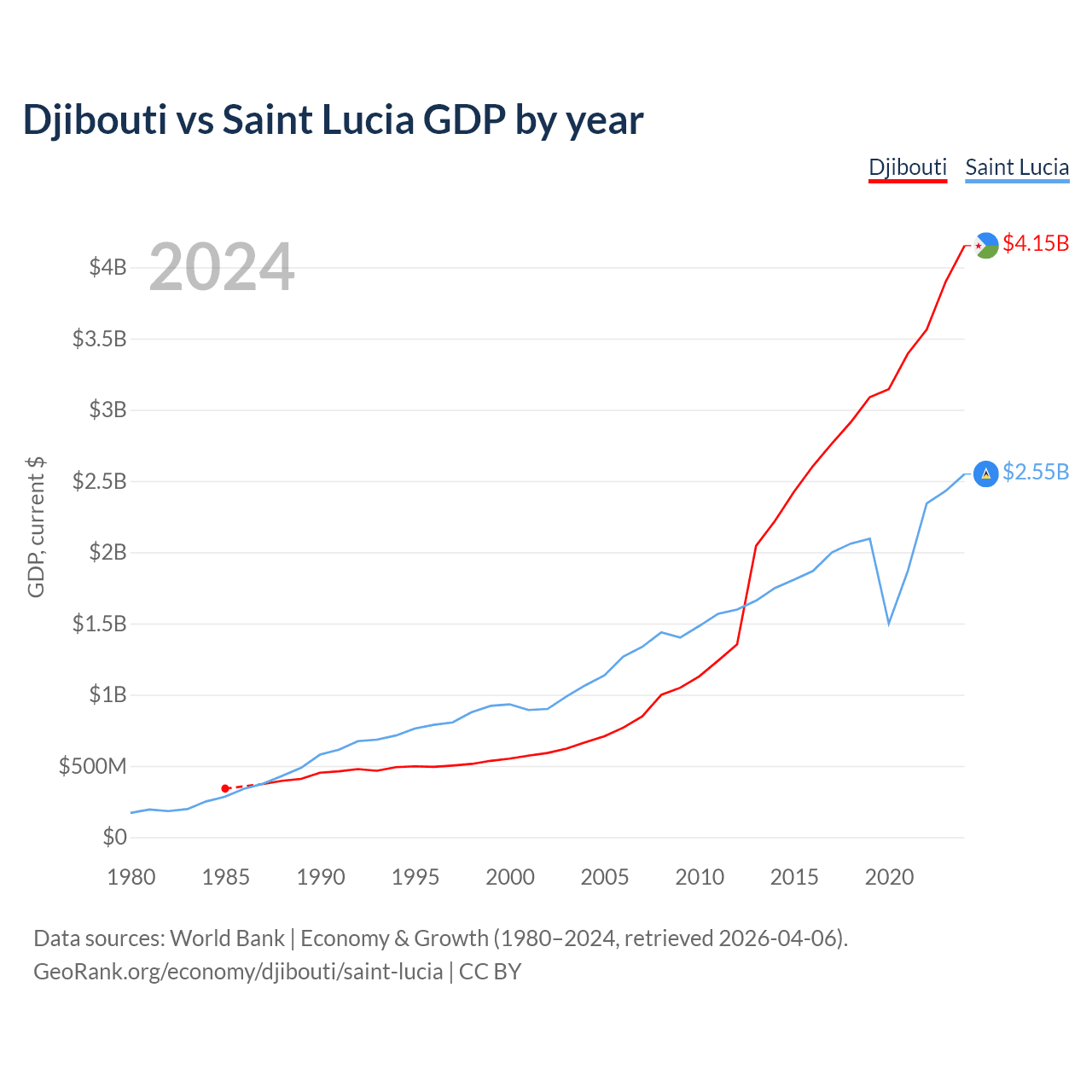 Djibouti has a GDP of $4.15B compared to $2.55B for Saint Lucia, ranking 165/197 and 173/197 by economy size, respectively.
