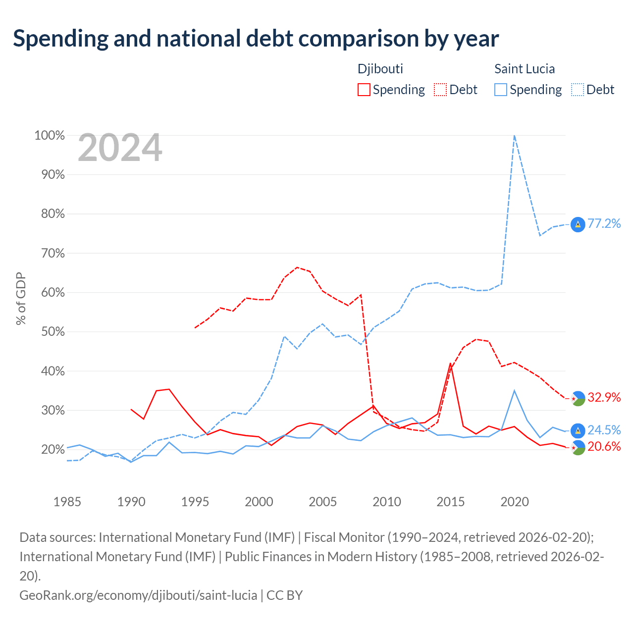 Djibouti has $1.36B in government debt (32.9% of GDP), compared to $1.97B (77.2% of GDP) in Saint Lucia.