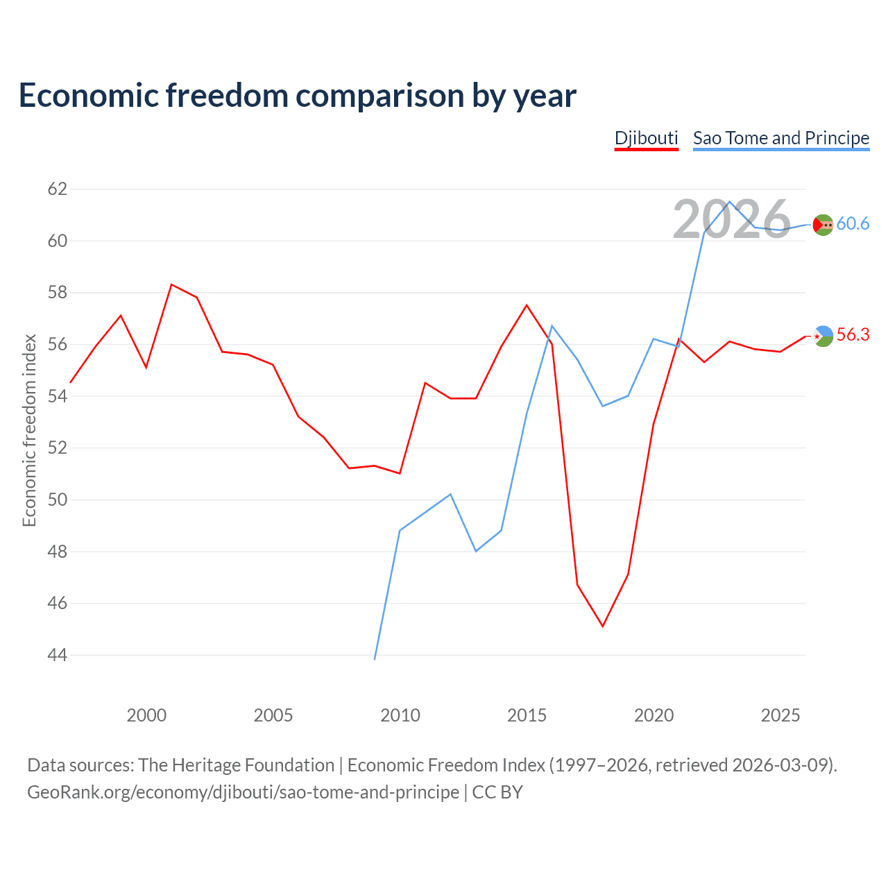 The Economic Freedom Index for Djibouti is 56.3, ranking 122/197, compared to 60.6 for Sao Tome and Principe, ranking 93/197. The chart above displays a comparison of annual changes in economic freedom indexes.