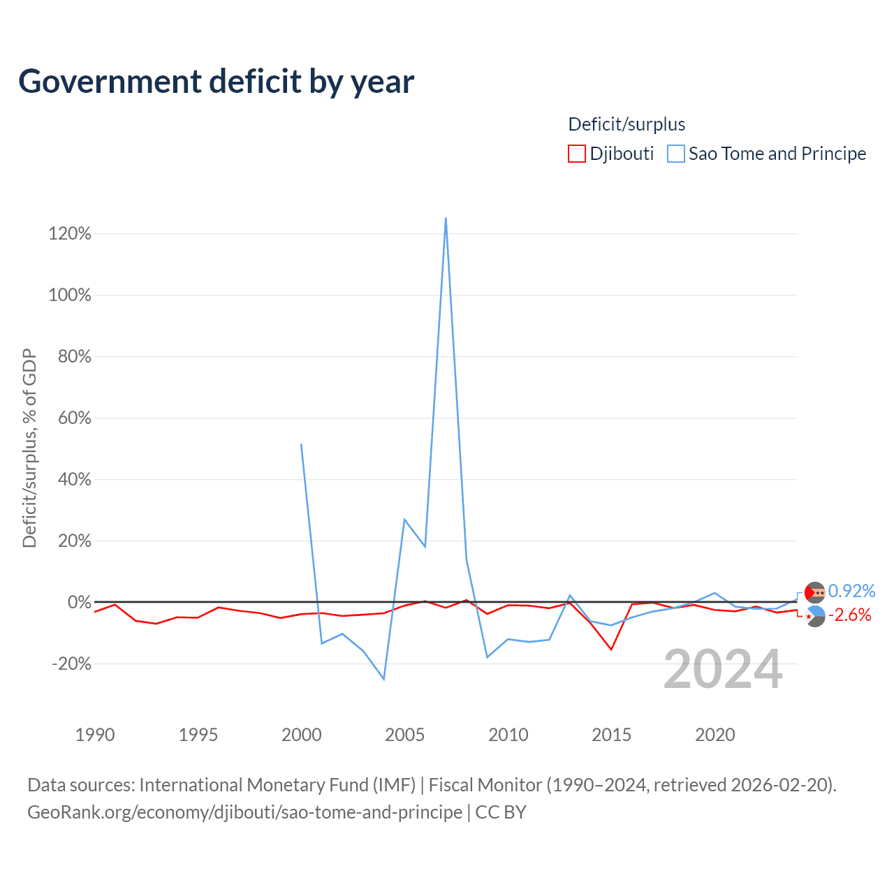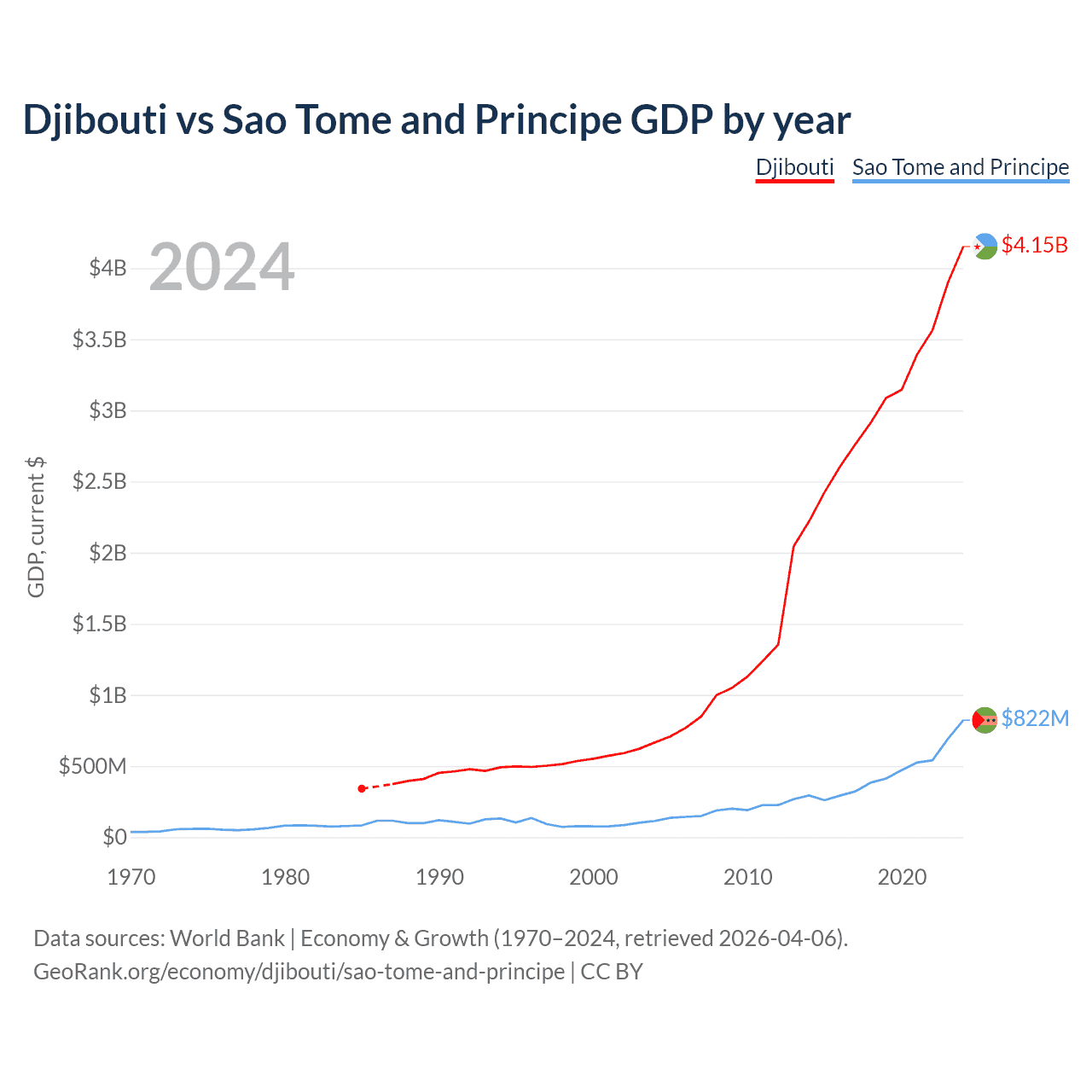 Djibouti has a GDP of $4.15B compared to $822M for Sao Tome and Principe, ranking 165/197 and 189/197 by economy size, respectively.