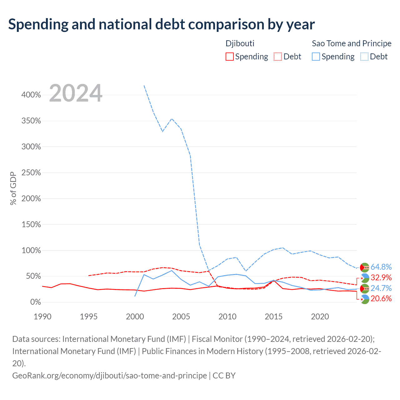 Djibouti has $1.36B in government debt (32.9% of GDP), compared to $533M (64.8% of GDP) in Sao Tome and Principe.