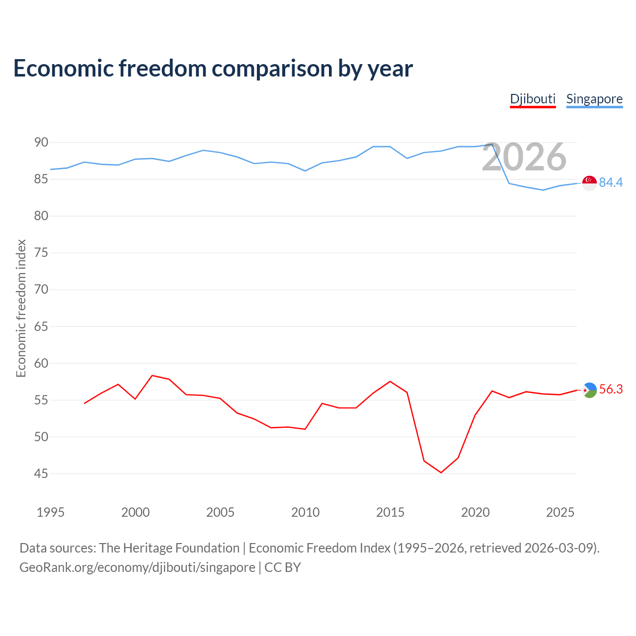 The Economic Freedom Index for Djibouti is 56.3, ranking 122/197, compared to 84.4 for Singapore, ranking 1/197. The chart above displays a comparison of annual changes in economic freedom indexes.