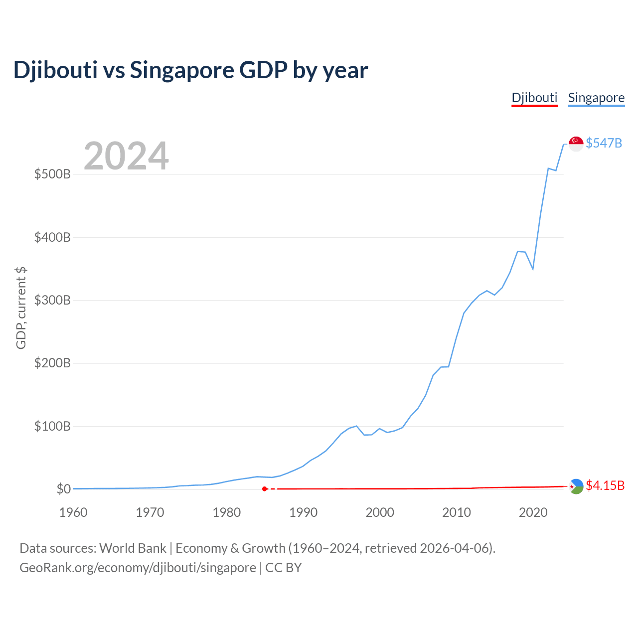 Djibouti has a GDP of $4.15B compared to $547B for Singapore, ranking 165/197 and 28/197 by economy size, respectively.