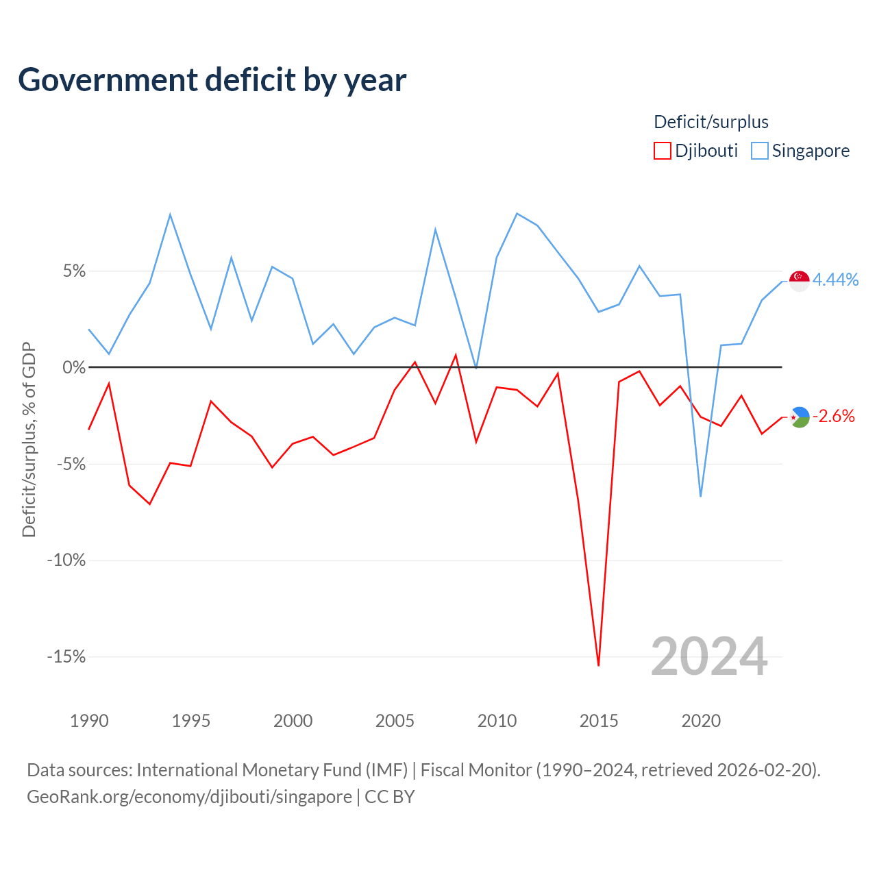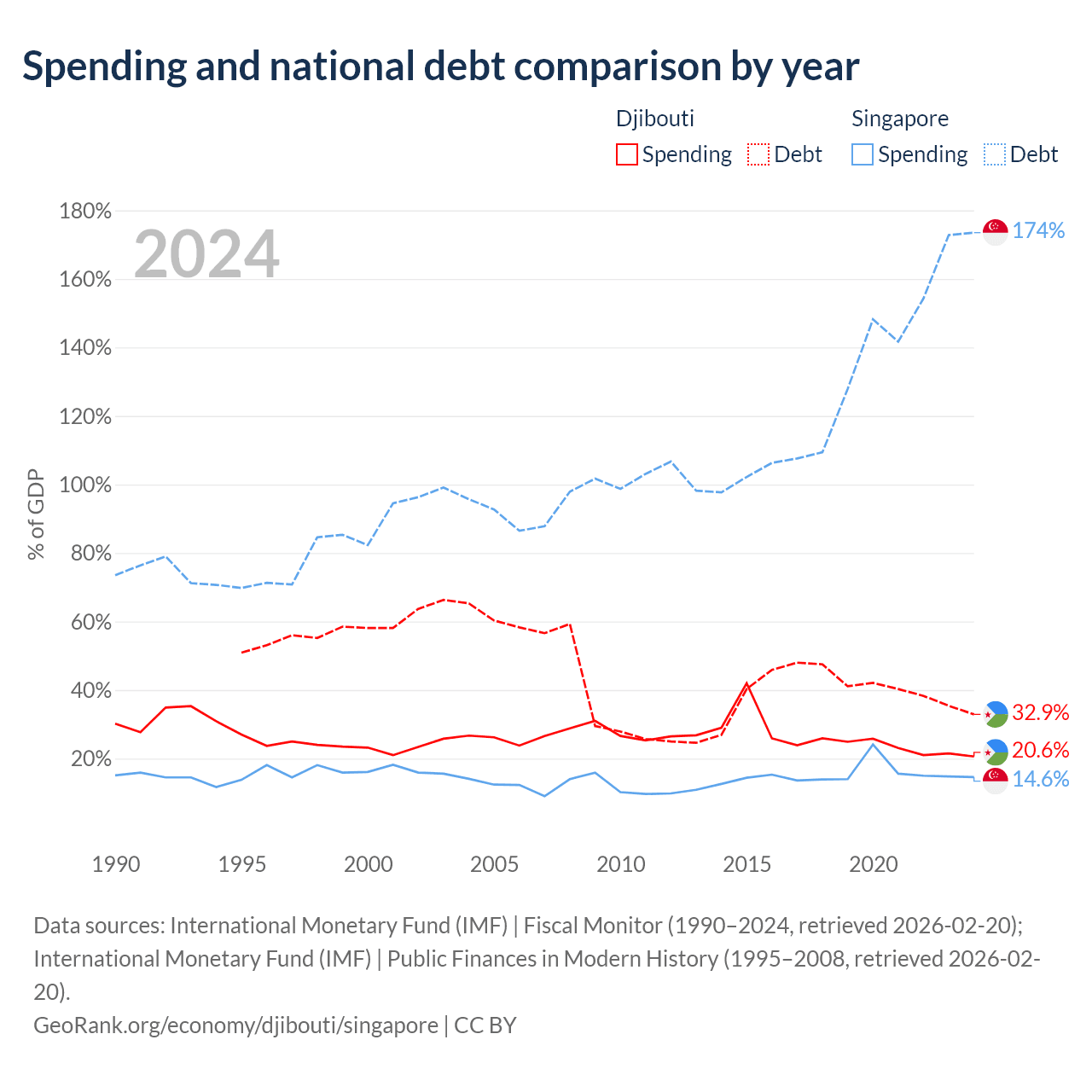 Djibouti has $1.36B in government debt (32.9% of GDP), compared to $950B (173.5% of GDP) in Singapore.