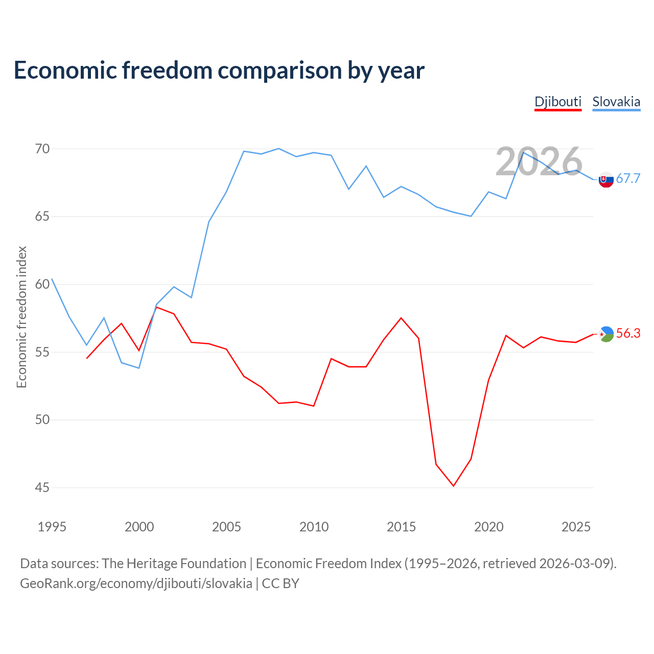 The Economic Freedom Index for Djibouti is 56.3, ranking 122/197, compared to 67.7 for Slovakia, ranking 54/197. The chart above displays a comparison of annual changes in economic freedom indexes.