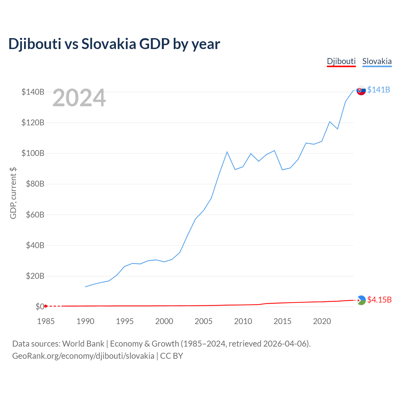 Djibouti has a GDP of $4.15B compared to $141B for Slovakia, ranking 165/197 and 61/197 by economy size, respectively.