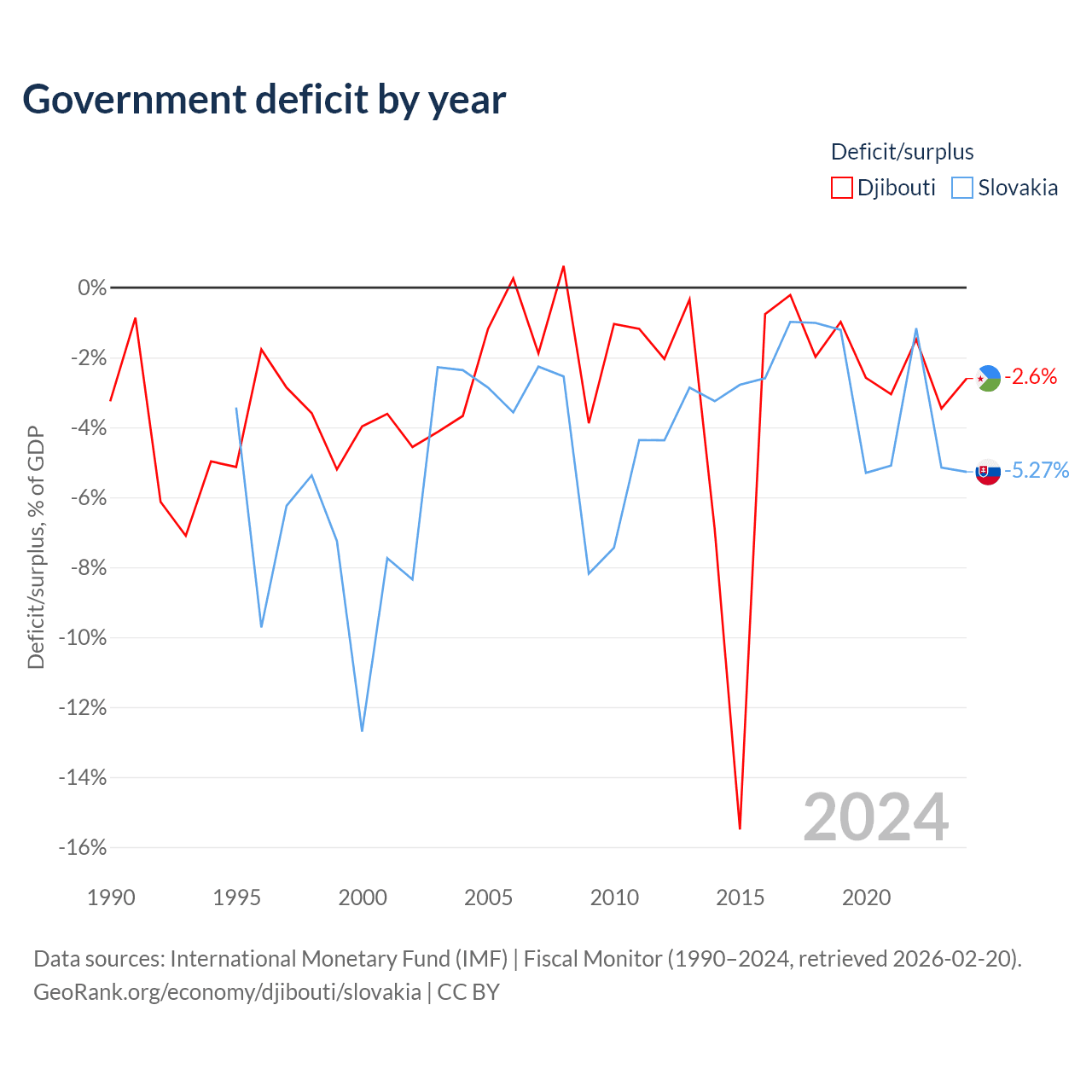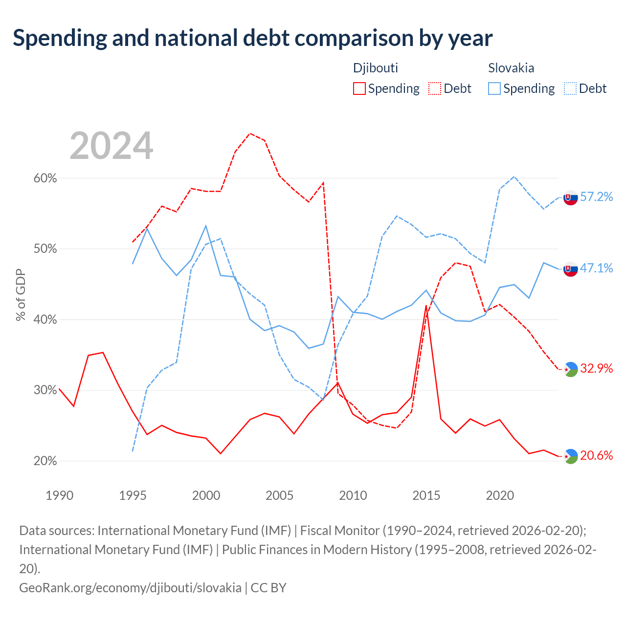 Djibouti has $1.36B in government debt (32.9% of GDP), compared to $80.7B (57.2% of GDP) in Slovakia.