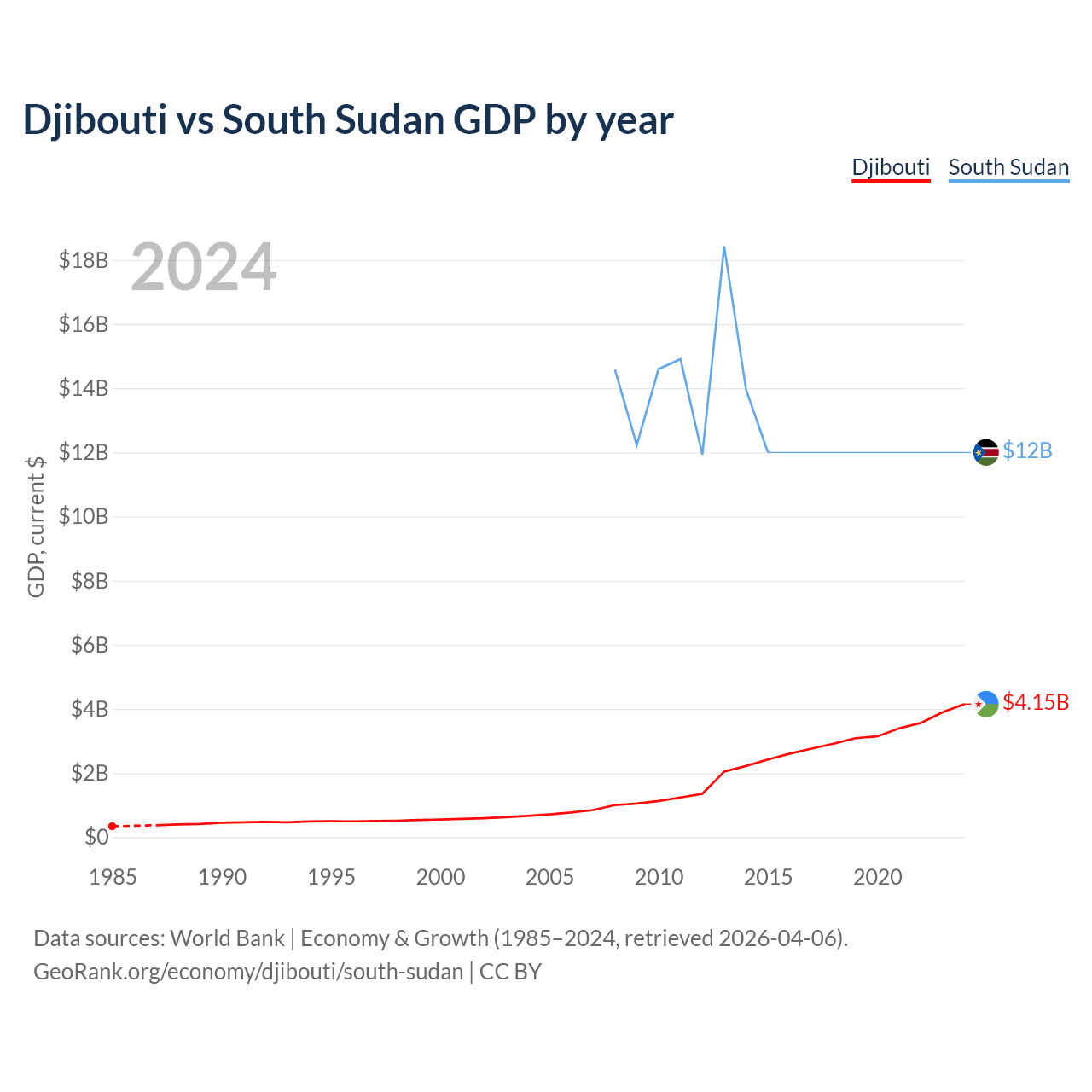 Djibouti has a GDP of $4.15B compared to $12B for South Sudan, ranking 165/197 and 149/197 by economy size, respectively.