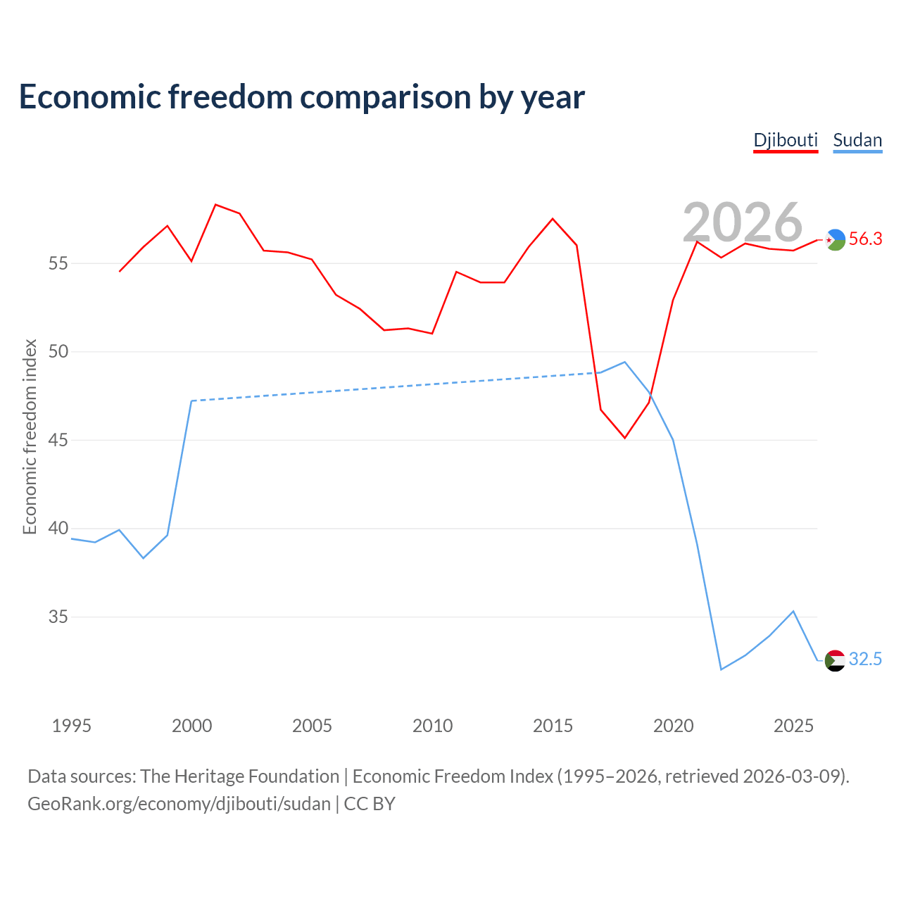 The Economic Freedom Index for Djibouti is 56.3, ranking 122/197, compared to 32.5 for Sudan, ranking 191/197. The chart above displays a comparison of annual changes in economic freedom indexes.