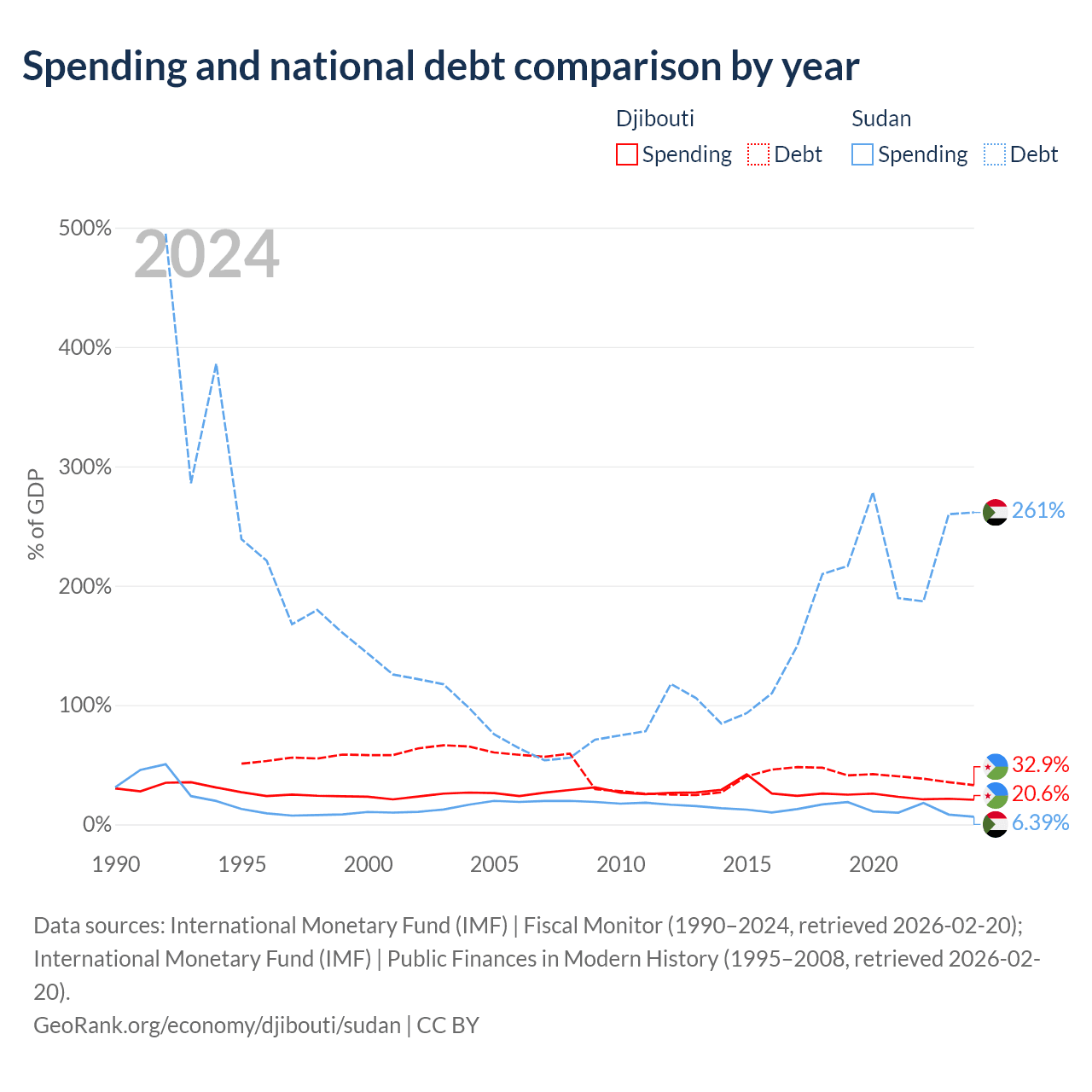 Djibouti has $1.36B in government debt (32.9% of GDP), compared to $130B (261.4% of GDP) in Sudan.