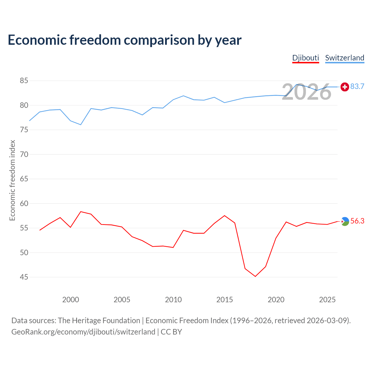 The Economic Freedom Index for Djibouti is 56.3, ranking 122/197, compared to 83.7 for Switzerland, ranking 2/197. The chart above displays a comparison of annual changes in economic freedom indexes.