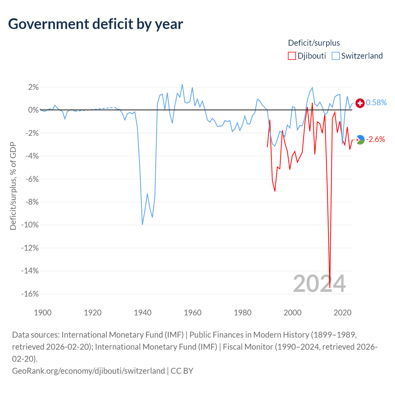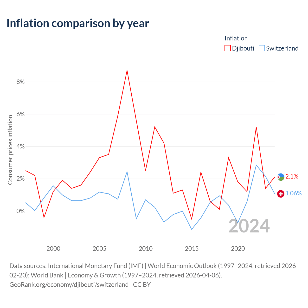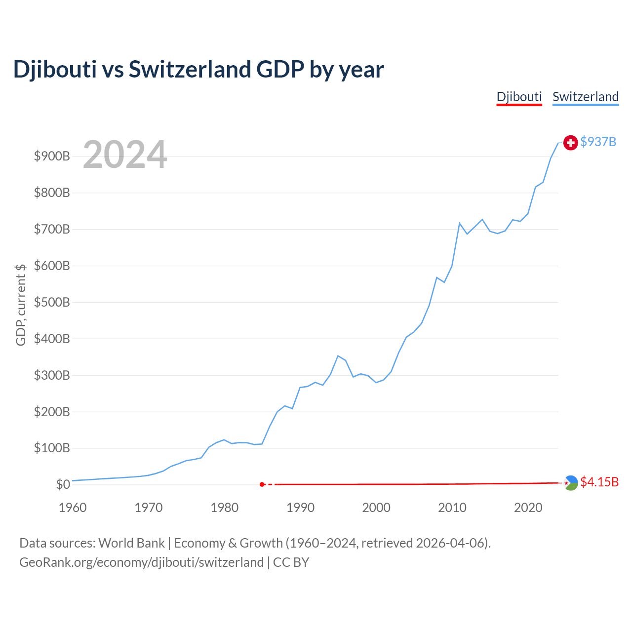 Djibouti has a GDP of $4.15B compared to $937B for Switzerland, ranking 165/197 and 20/197 by economy size, respectively.