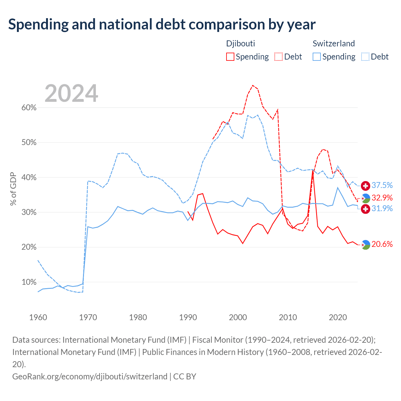 Djibouti has $1.36B in government debt (32.9% of GDP), compared to $351B (37.5% of GDP) in Switzerland.
