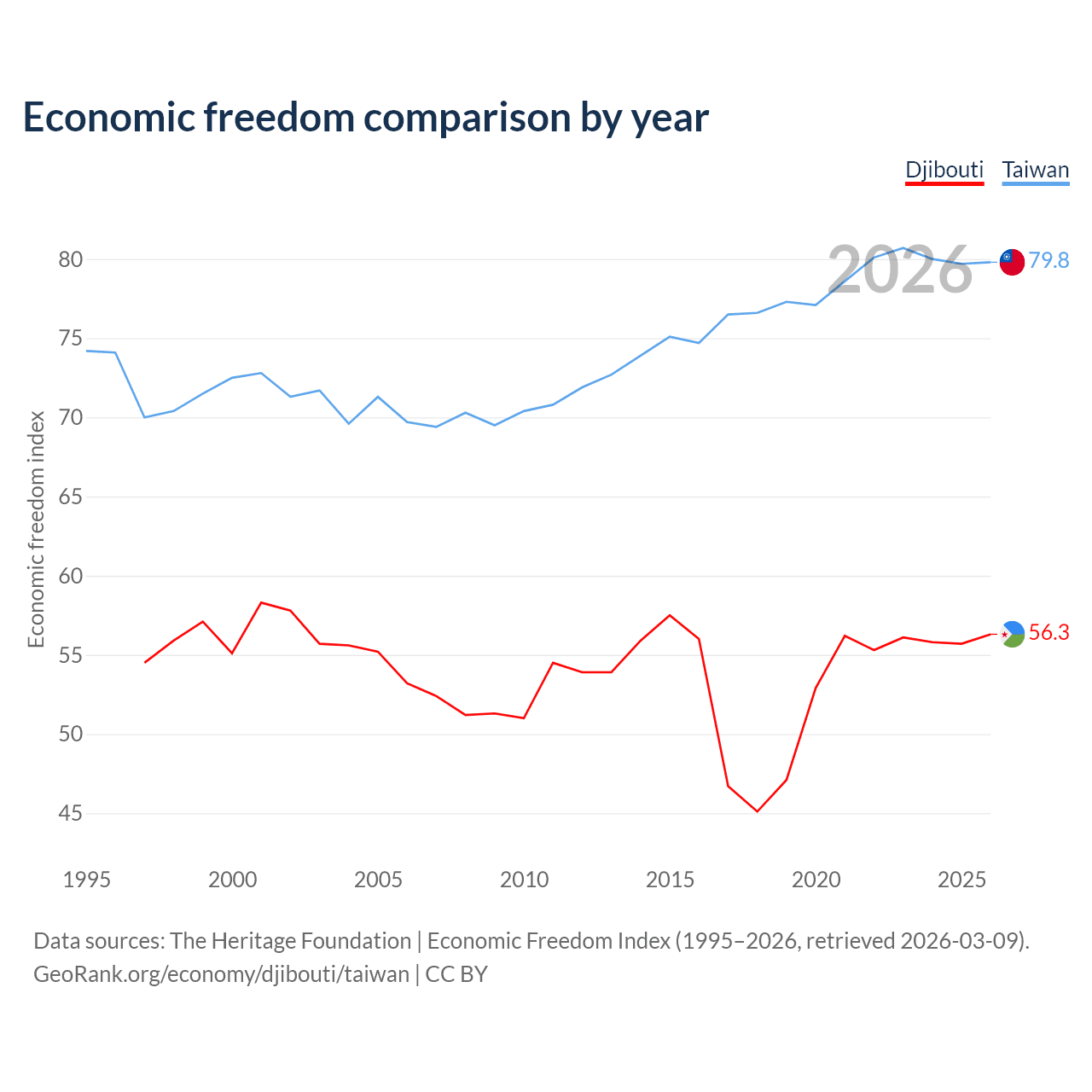 The Economic Freedom Index for Djibouti is 56.3, ranking 122/197, compared to 79.8 for Taiwan, ranking 6/197. The chart above displays a comparison of annual changes in economic freedom indexes.