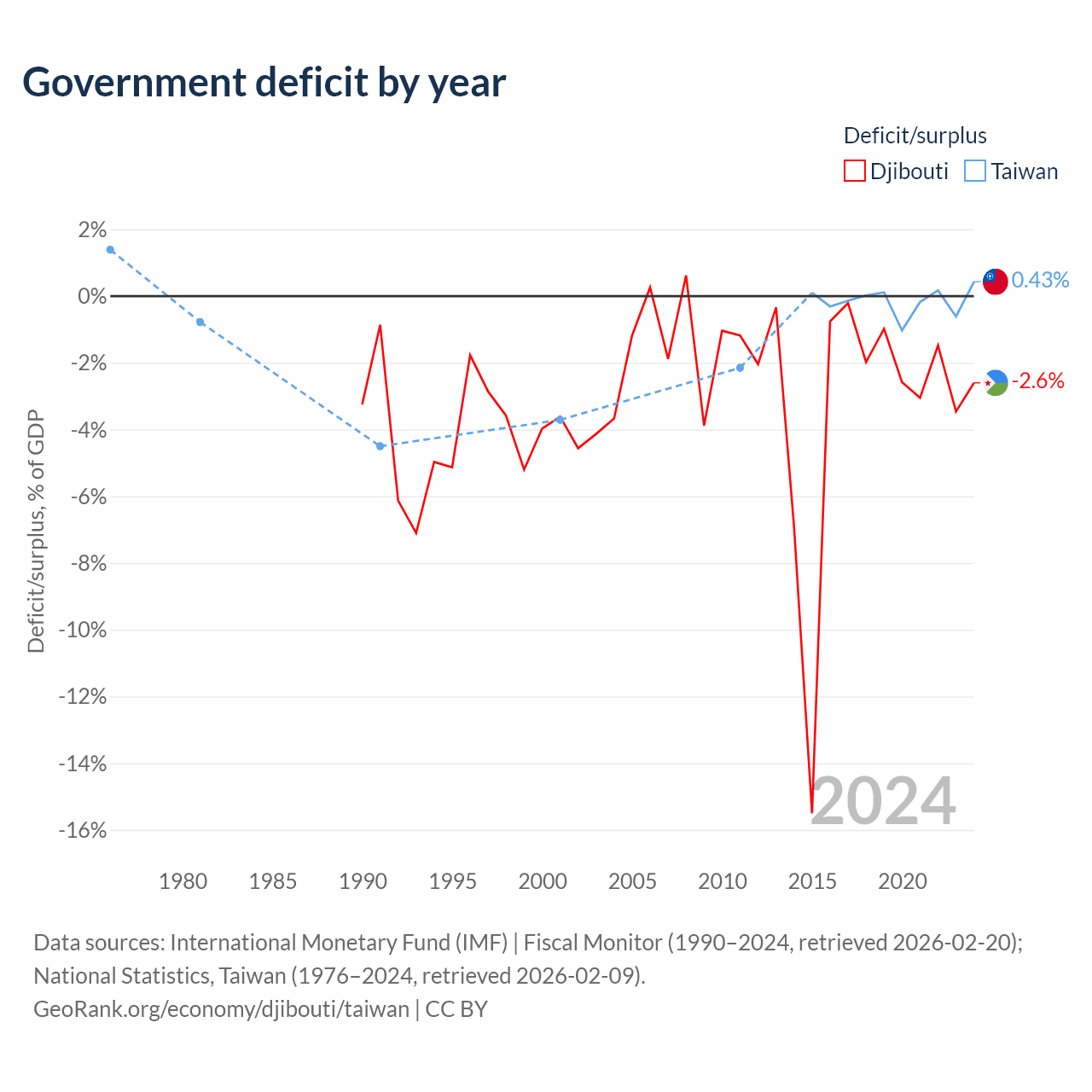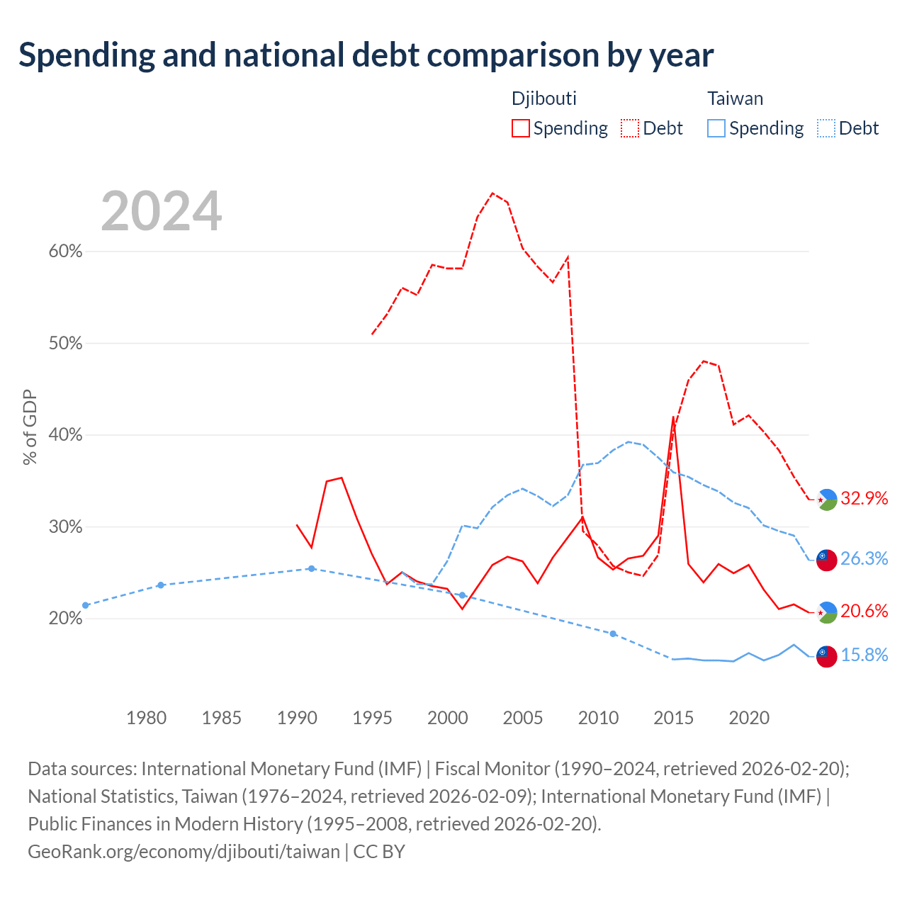 Djibouti has $1.36B in government debt (32.9% of GDP), compared to $211B (26.3% of GDP) in Taiwan.
