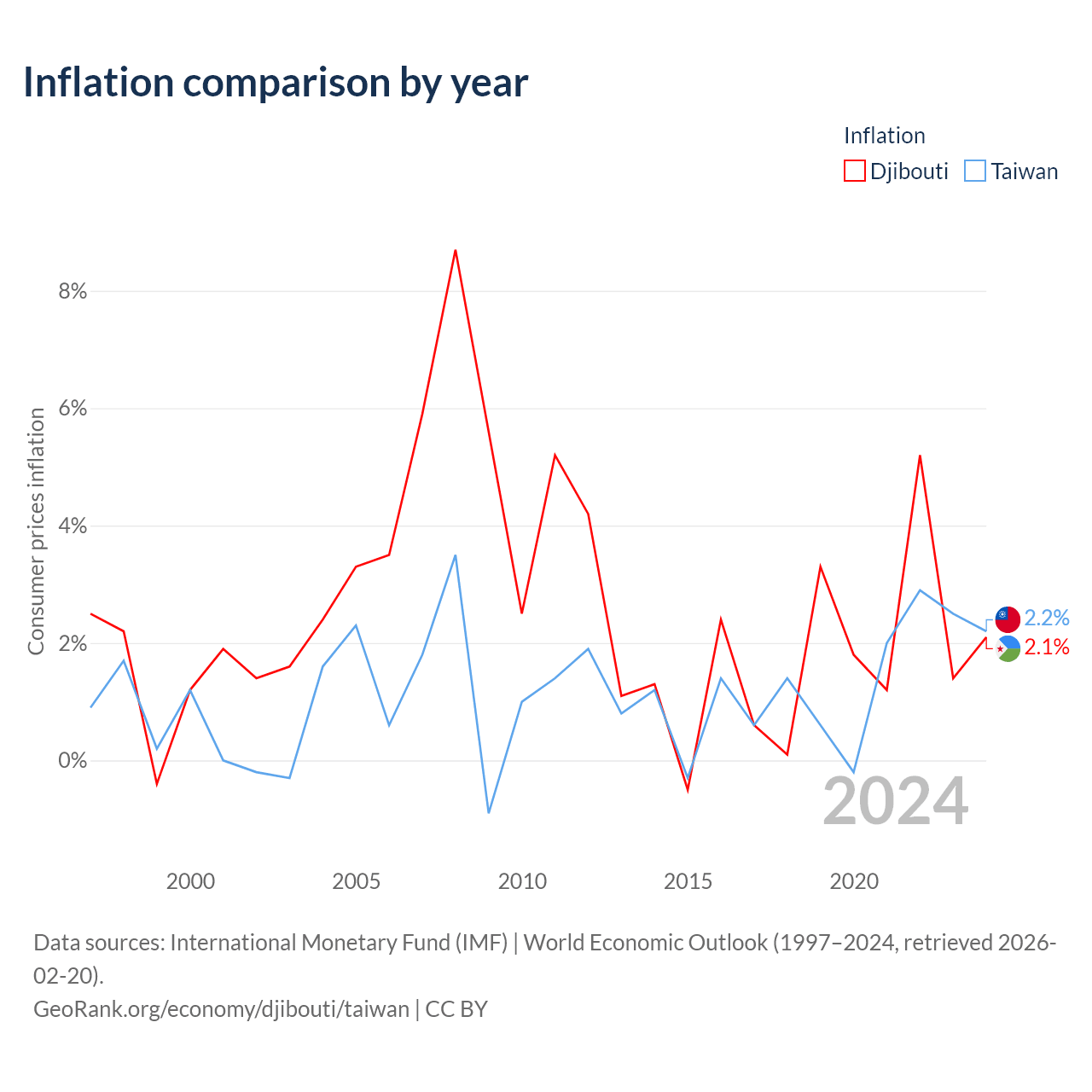 Djibouti has a GDP of $4.15B compared to $802B for Taiwan, ranking 165/197 and 22/197 by economy size, respectively.