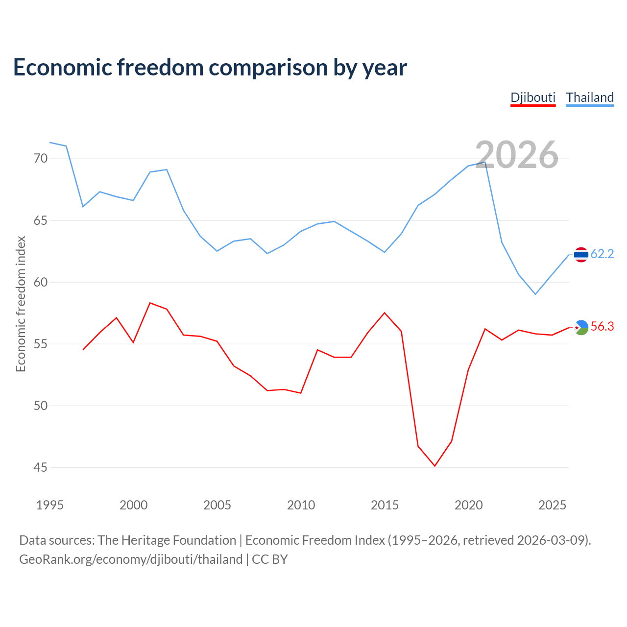 The Economic Freedom Index for Djibouti is 56.3, ranking 122/197, compared to 62.2 for Thailand, ranking 88/197. The chart above displays a comparison of annual changes in economic freedom indexes.