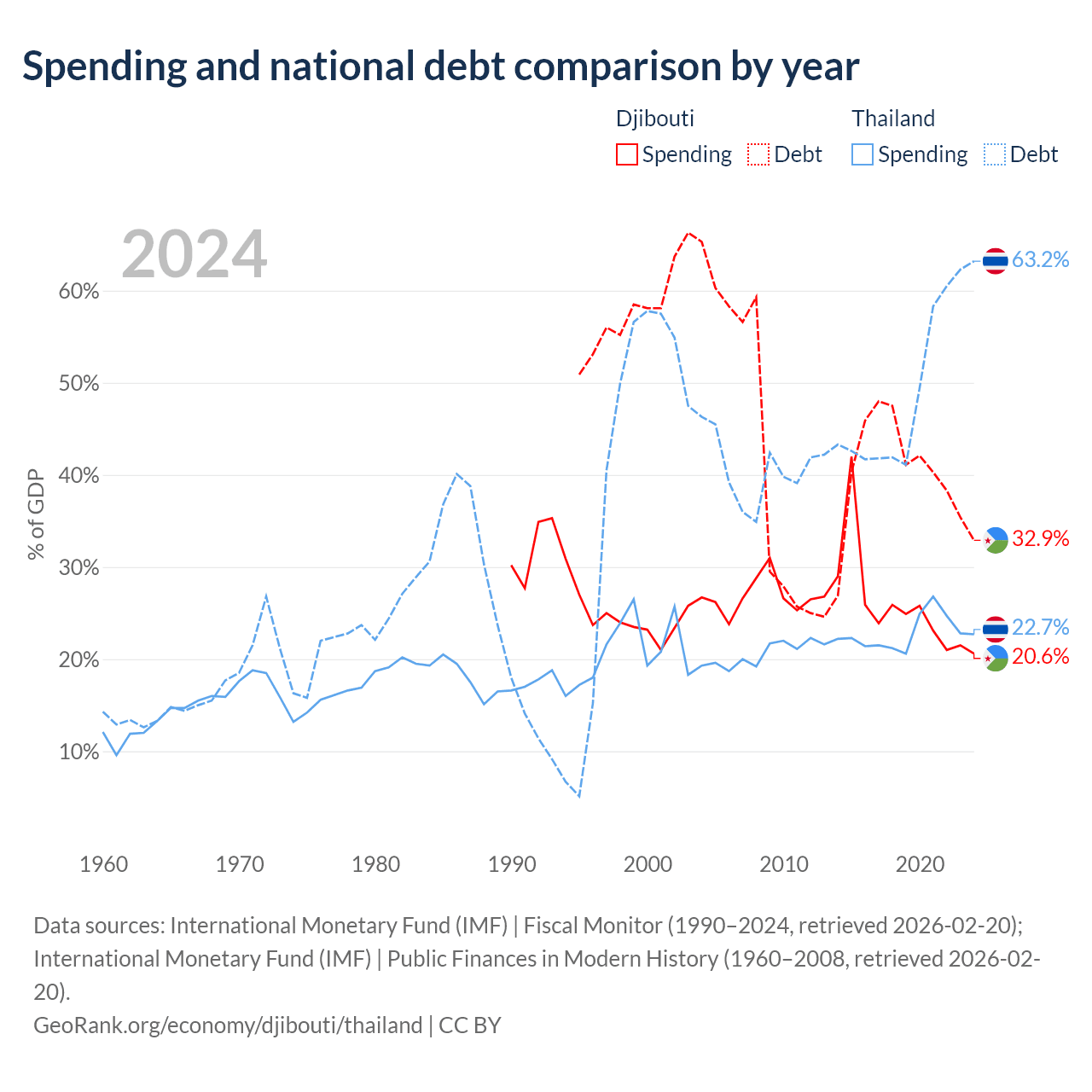 Djibouti has $1.36B in government debt (32.9% of GDP), compared to $333B (63.2% of GDP) in Thailand.