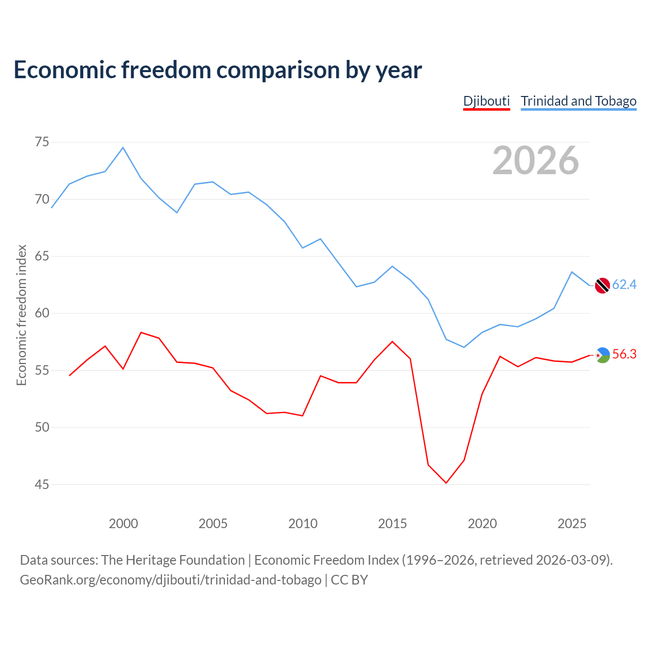 The Economic Freedom Index for Djibouti is 56.3, ranking 122/197, compared to 62.4 for Trinidad and Tobago, ranking 87/197. The chart above displays a comparison of annual changes in economic freedom indexes.