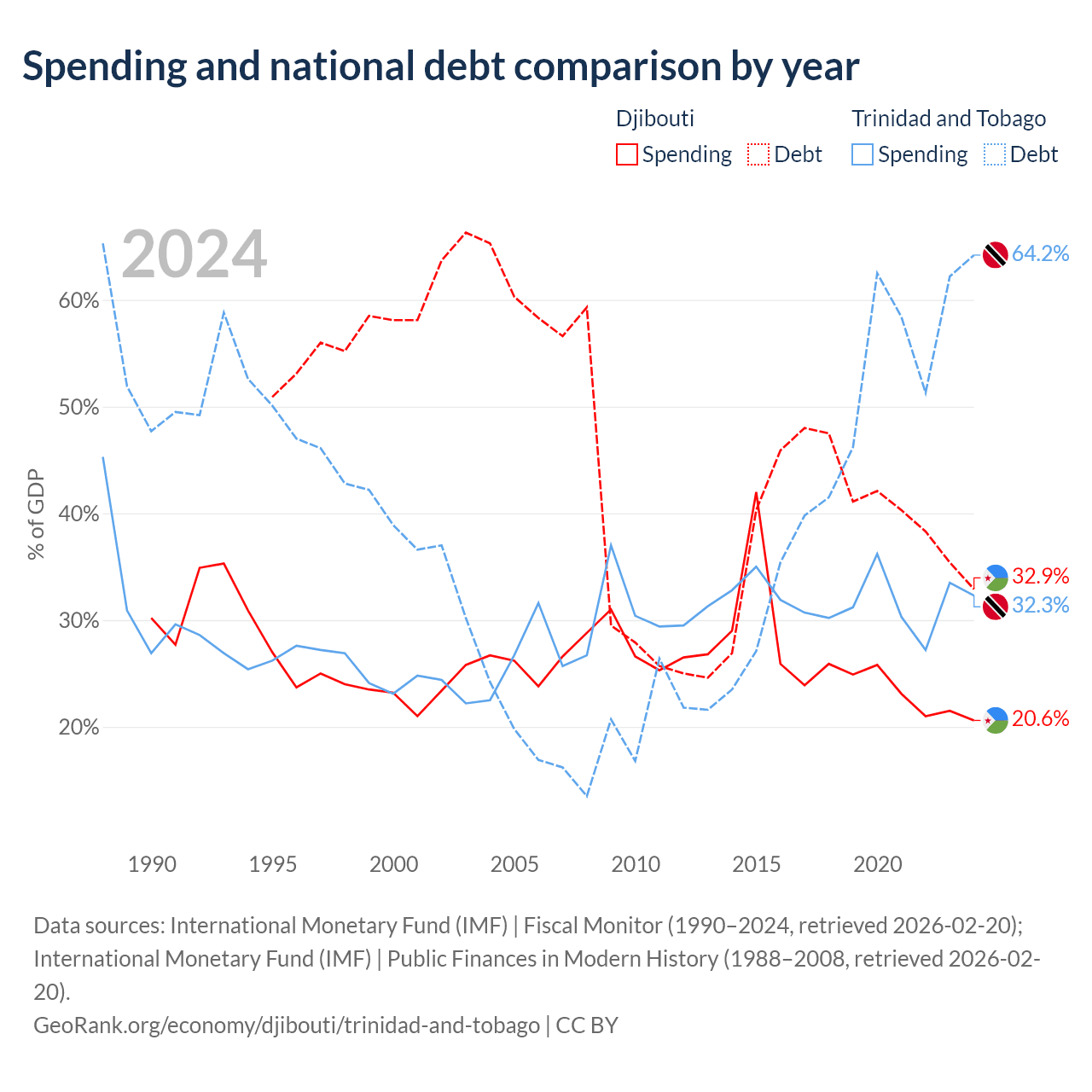 Djibouti has $1.36B in government debt (32.9% of GDP), compared to $16.5B (64.2% of GDP) in Trinidad and Tobago.