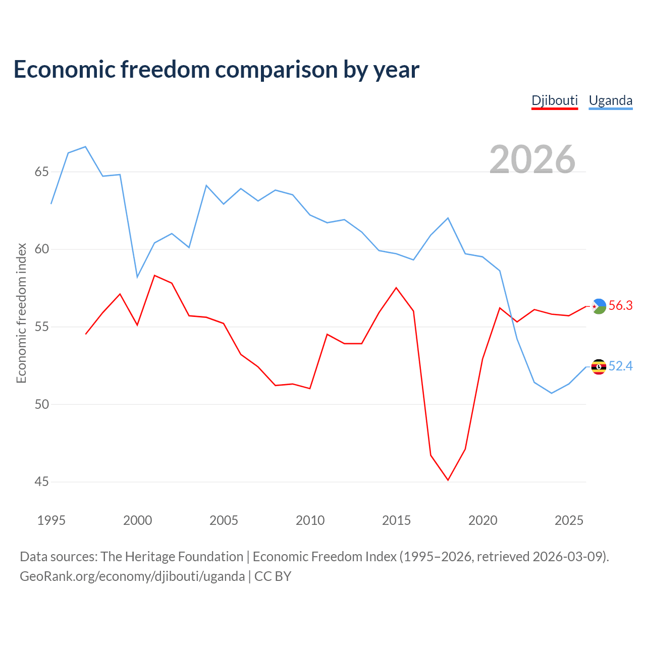 The Economic Freedom Index for Djibouti is 56.3, ranking 122/197, compared to 52.4 for Uganda, ranking 149/197. The chart above displays a comparison of annual changes in economic freedom indexes.