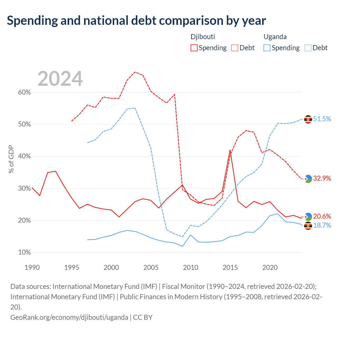 Djibouti has $1.36B in government debt (32.9% of GDP), compared to $27.8B (51.5% of GDP) in Uganda.