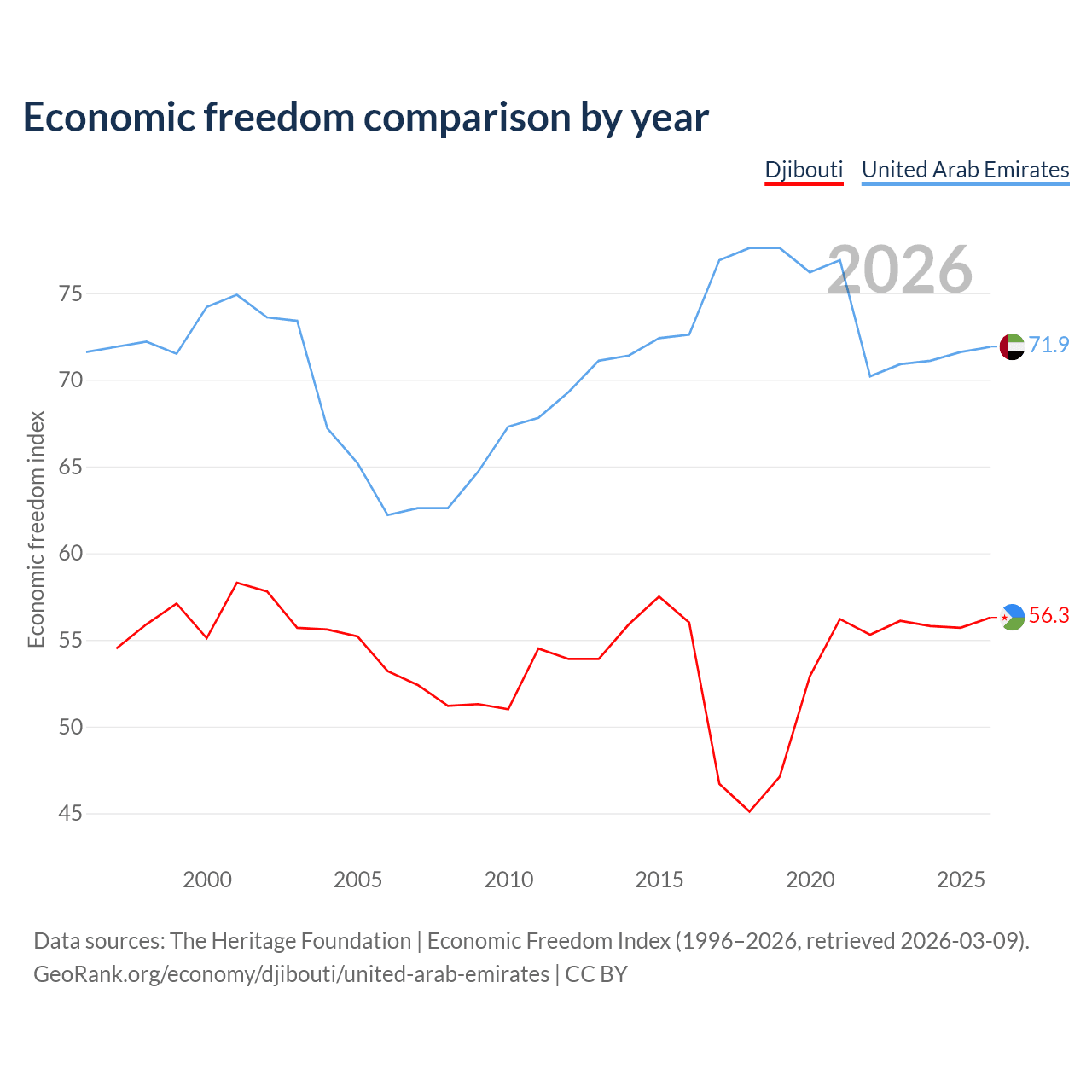 The Economic Freedom Index for Djibouti is 56.3, ranking 122/197, compared to 71.9 for the United Arab Emirates, ranking 29/197. The chart above displays a comparison of annual changes in economic freedom indexes.