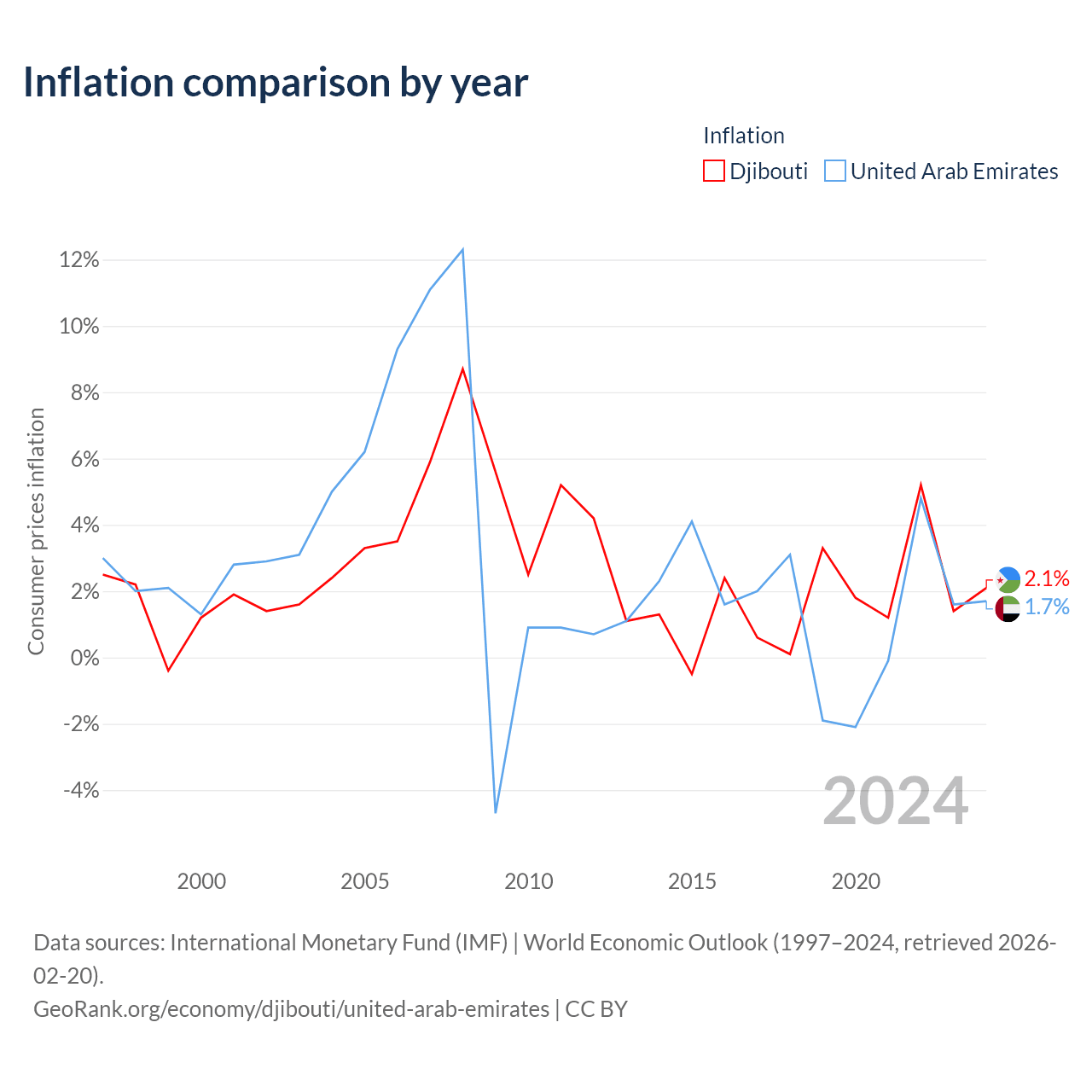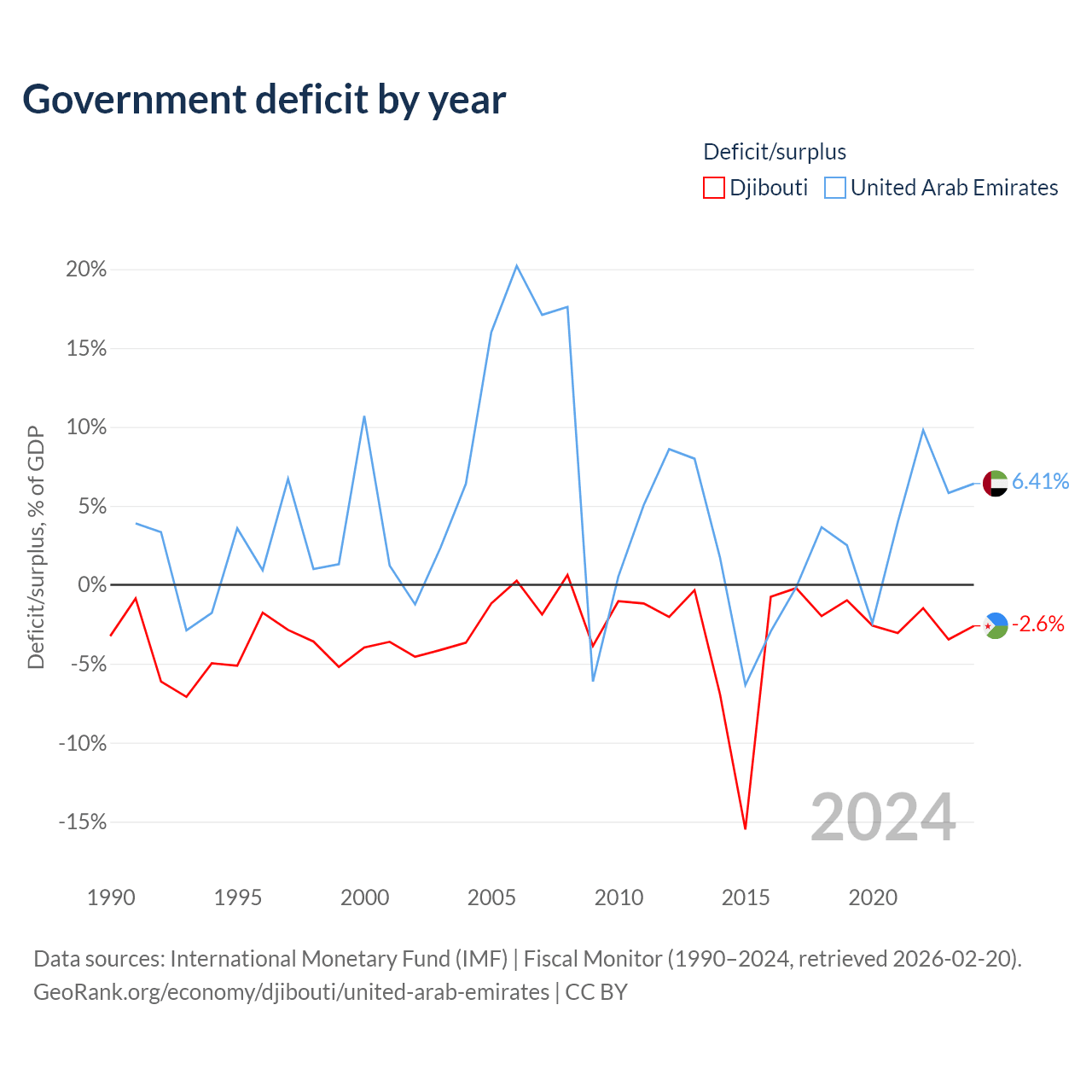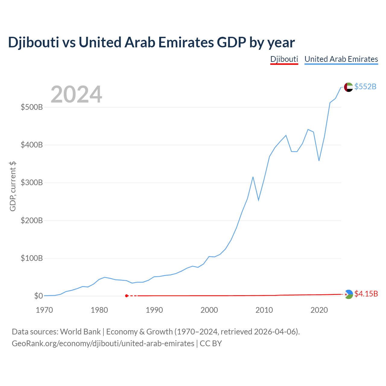 Djibouti has a GDP of $4.15B compared to $552B for the United Arab Emirates, ranking 165/197 and 27/197 by economy size, respectively.
